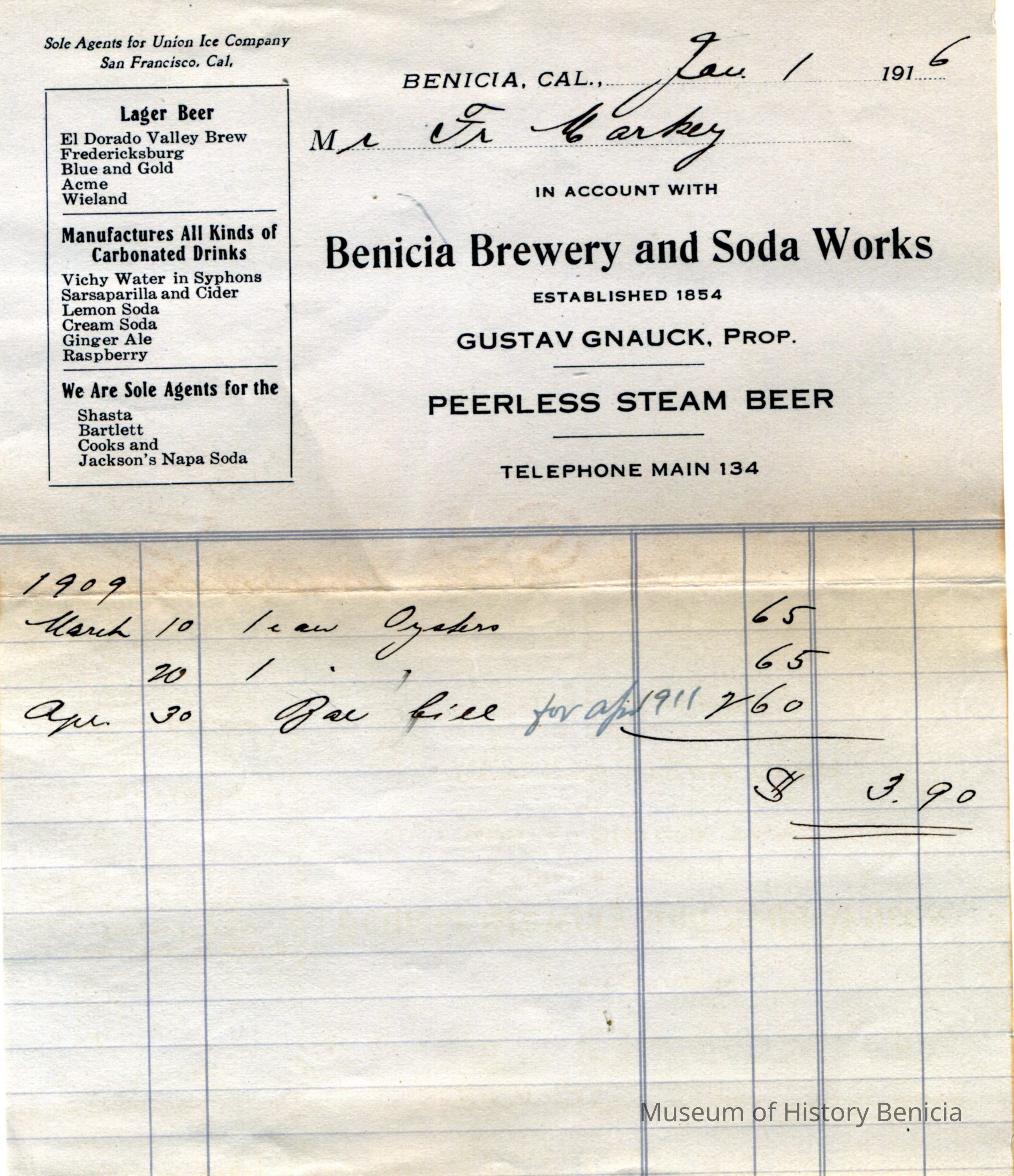 Receipt from Benicia Brewery and Soda Works Mr. Frank Markey on 01/01/1916.