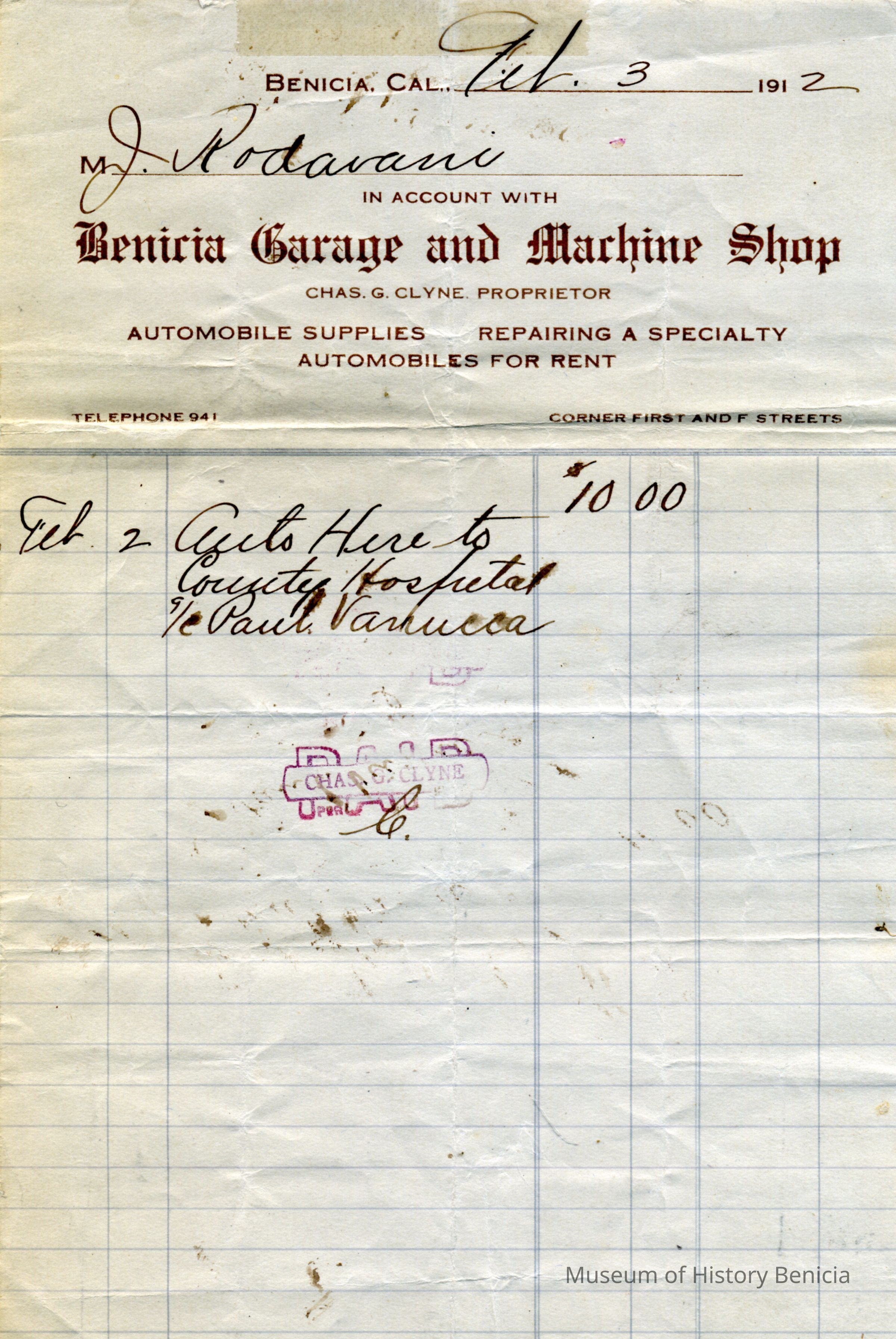 Receipt from Benicia Garage and Machine Shop to Mr. J Rodavani for accounts to County Hospital c/o Paul Vanducca on 02/03/1912.