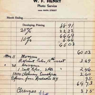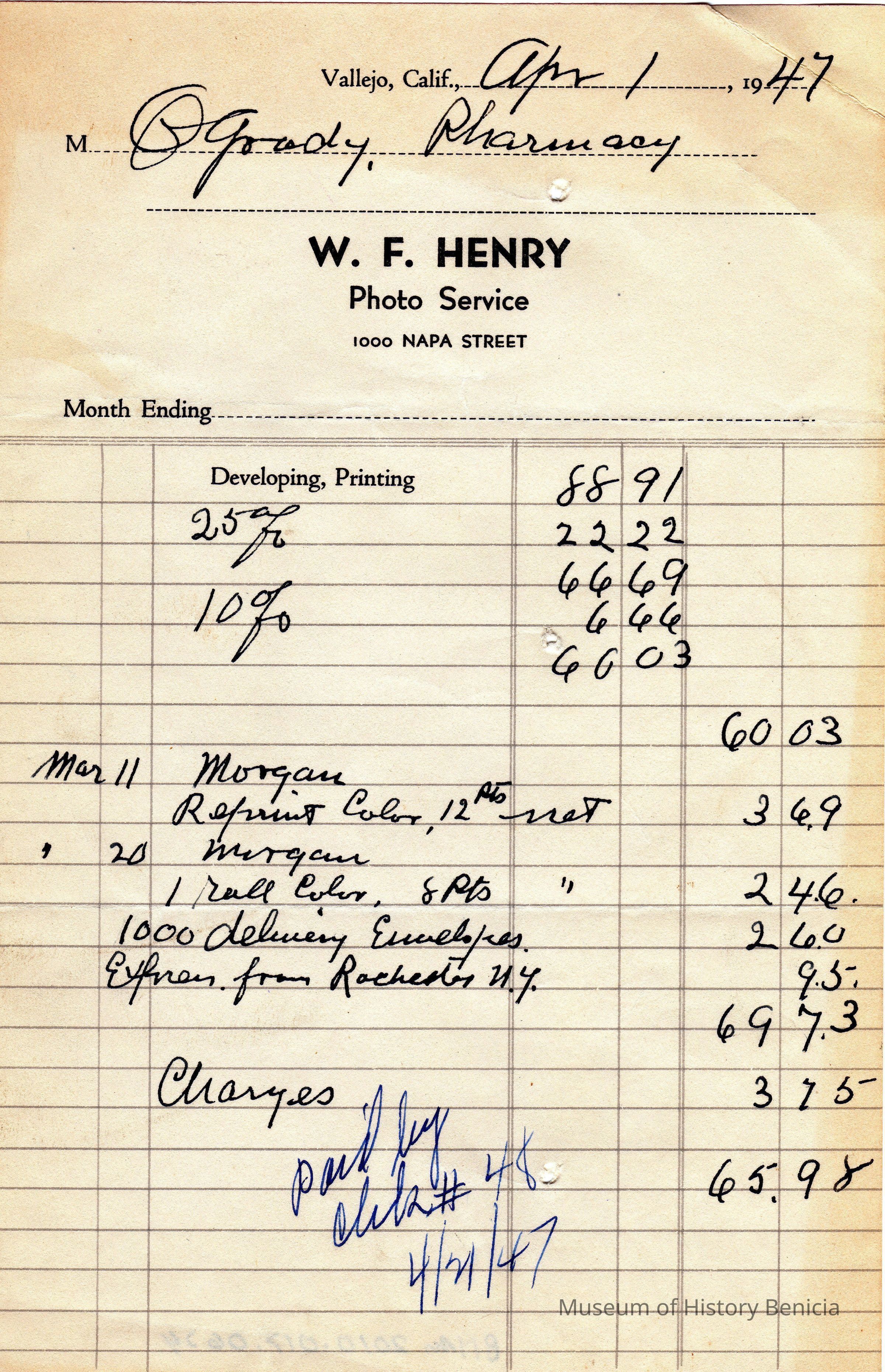 Receipt from WF Henry Photo Service of Napa to O'Grady Drug store dated April, 1 1947 for developing and printing services.