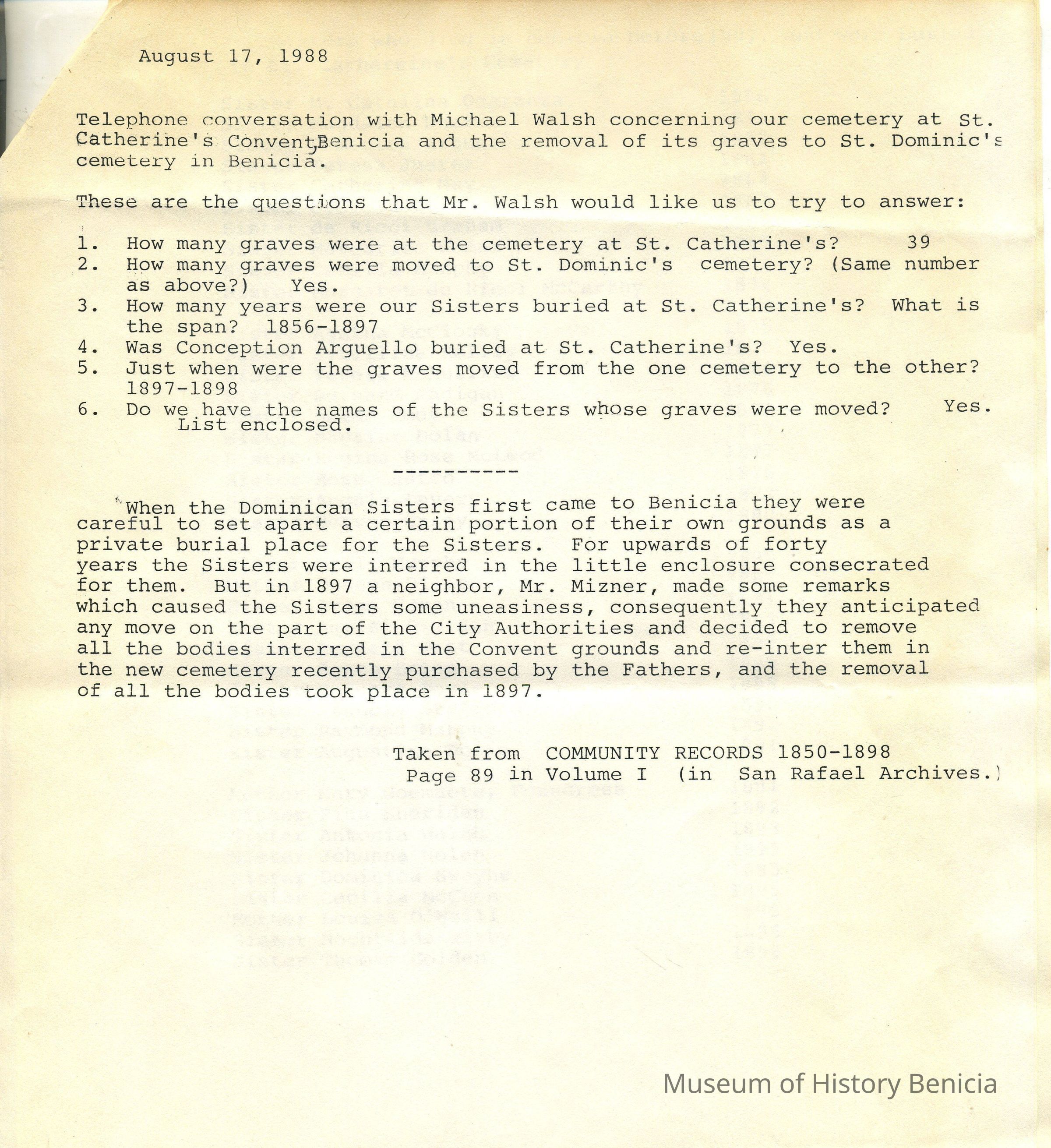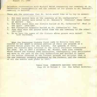 Page Two: Dated August 17, 1988 "Typed from Community Records 1850-1898, Page 89 in Volume I (in San Rafael Archives.)" Answers to questions regarding the Sisters buried at Saint Catherines.