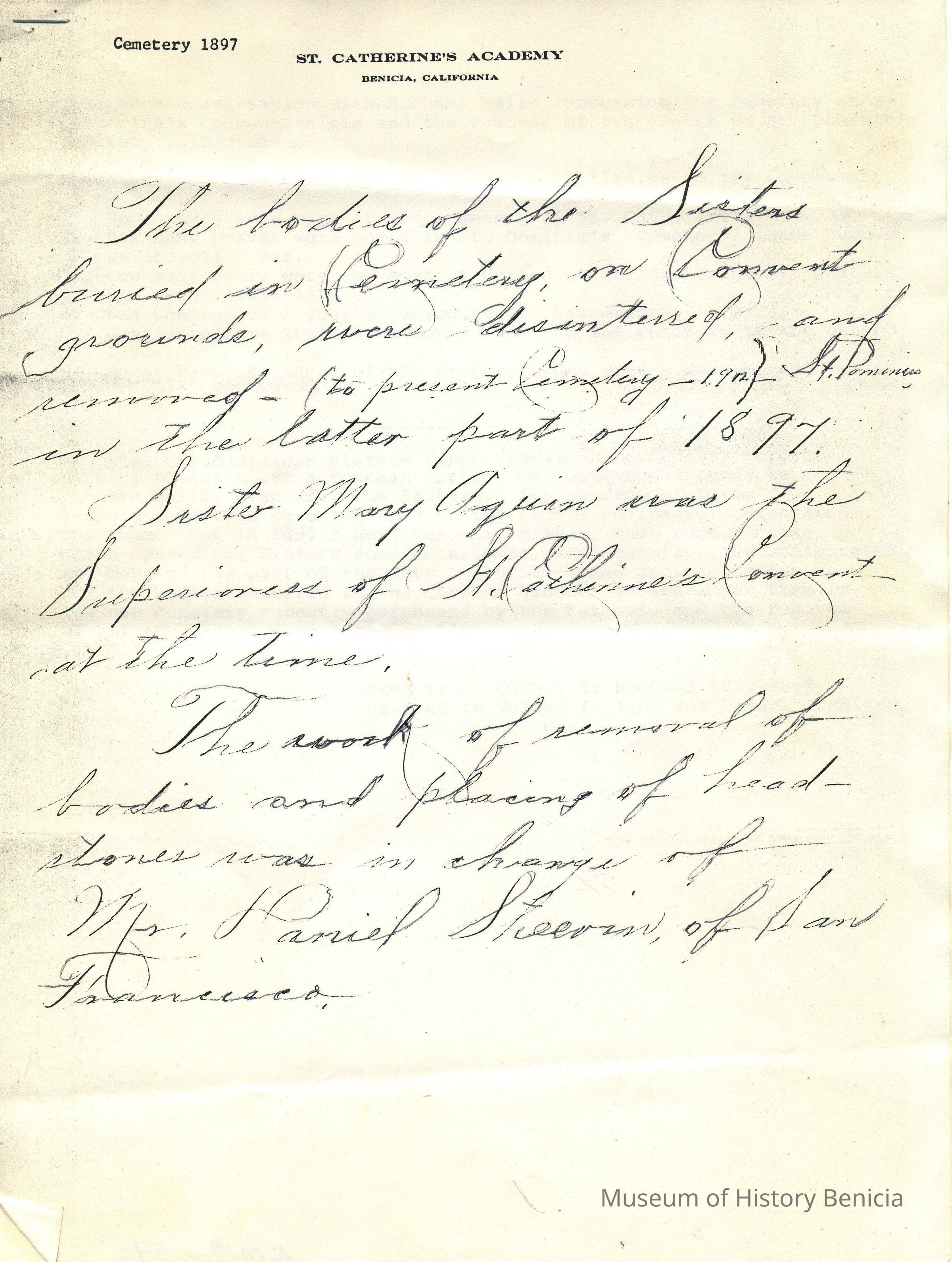 Page One: Handwritten: "The bodies of the Sisters buried in Cemetery on Convent grounds, were disinterred and removed - (to present Cemetery - 1912) St. Dominics in the latter part of 1897.