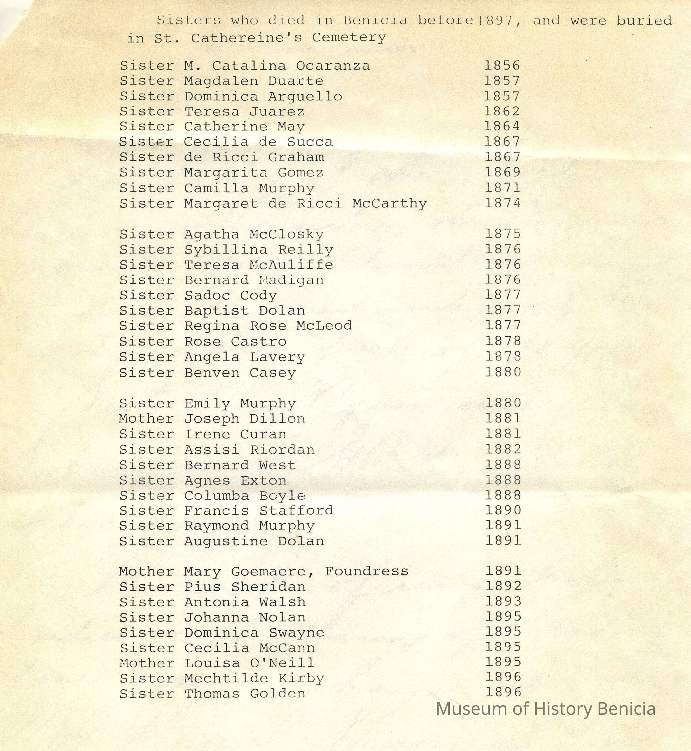 Page Three: Typed Listing of Sisters who died i Benicia before 1897 and were buried in St. Catherine's Cemetery (39 names)Collection