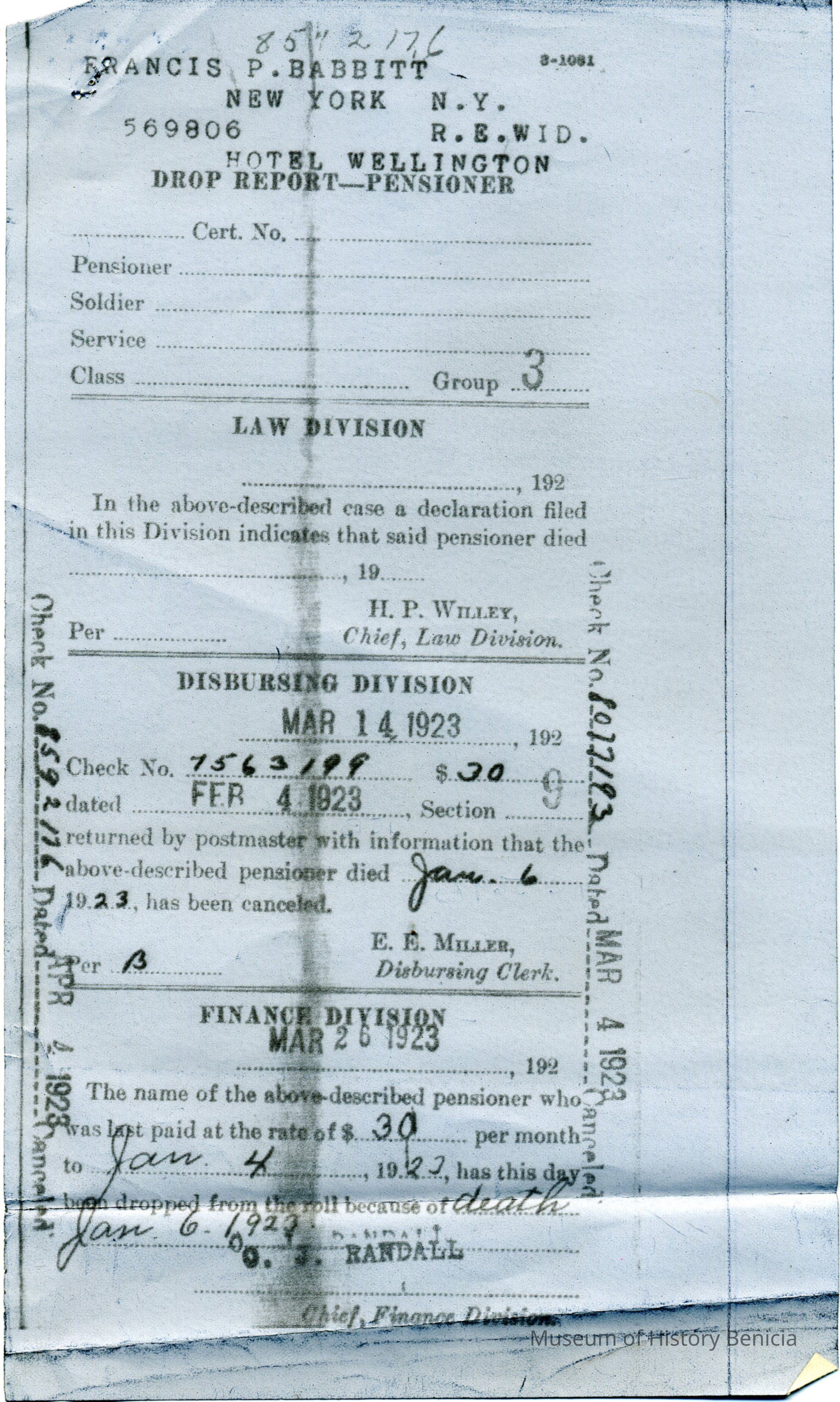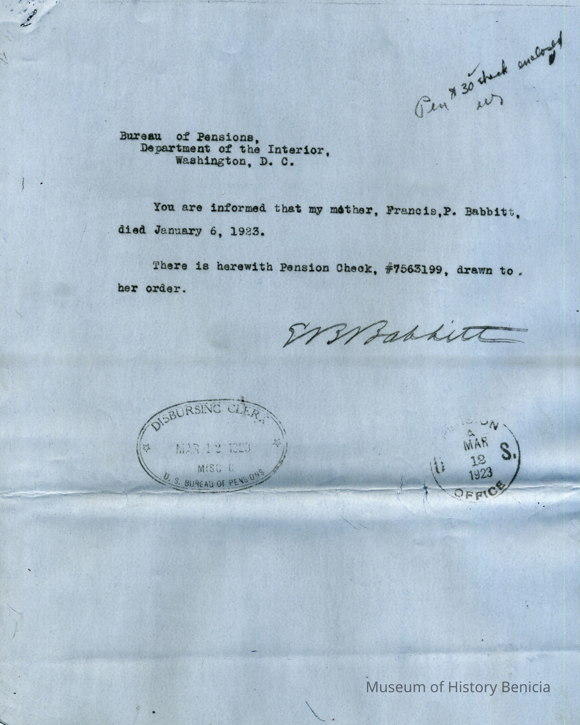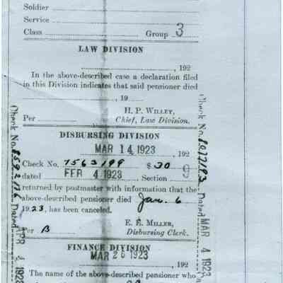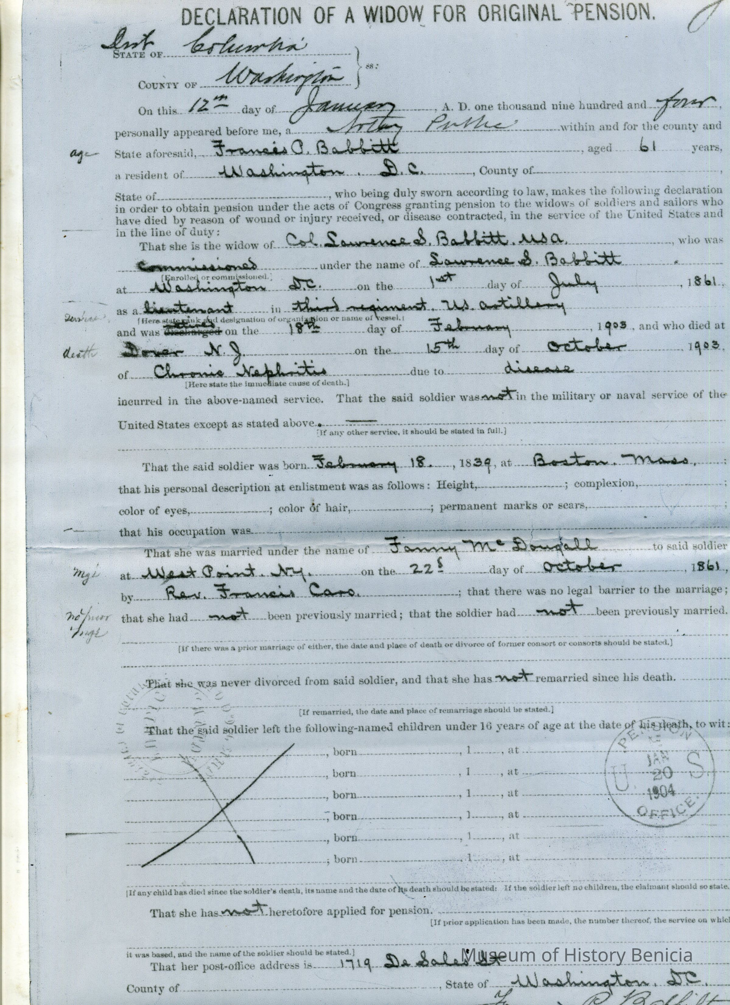 This is an application for Widow's Pension from Francis P. Babbitt who was the widow of Col. Lawrence S Babbitt the Commander of Benicia Arsenal 1890-1899. It contains the application for pension a letter regarding her death (01/06/1923) and a Disbursing slip.Collection