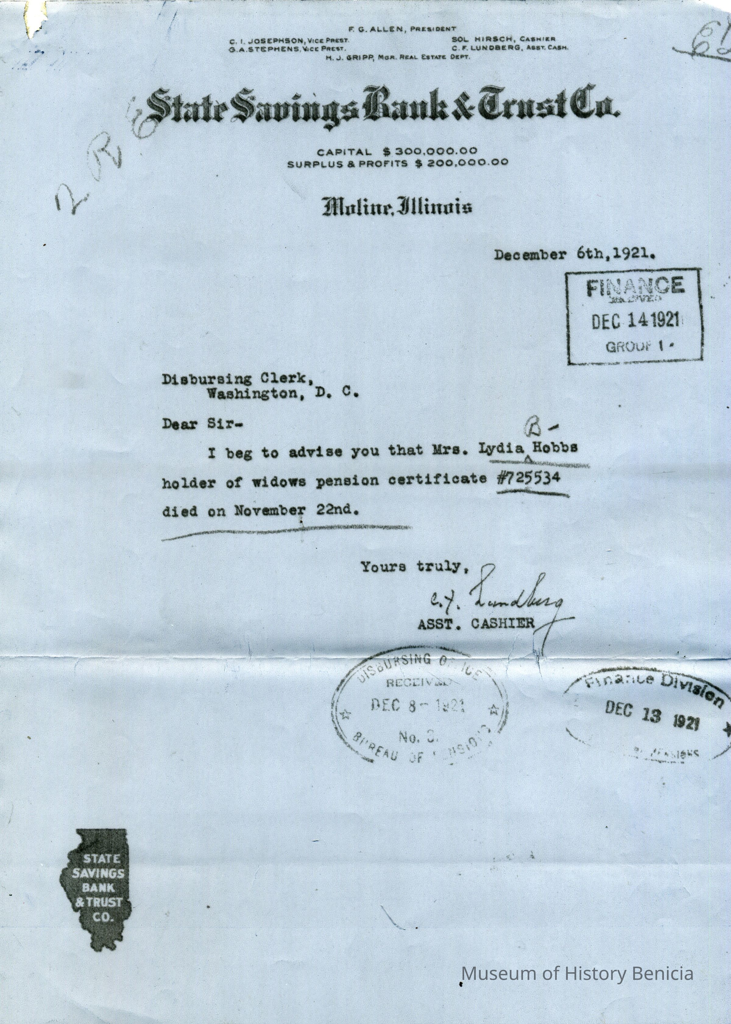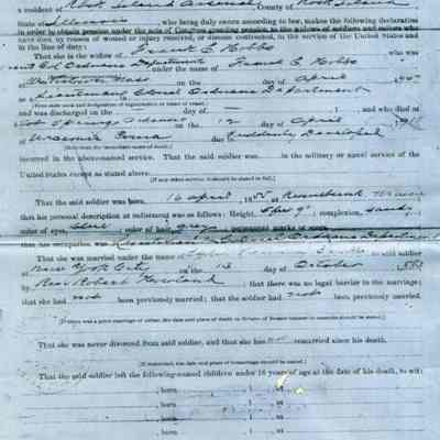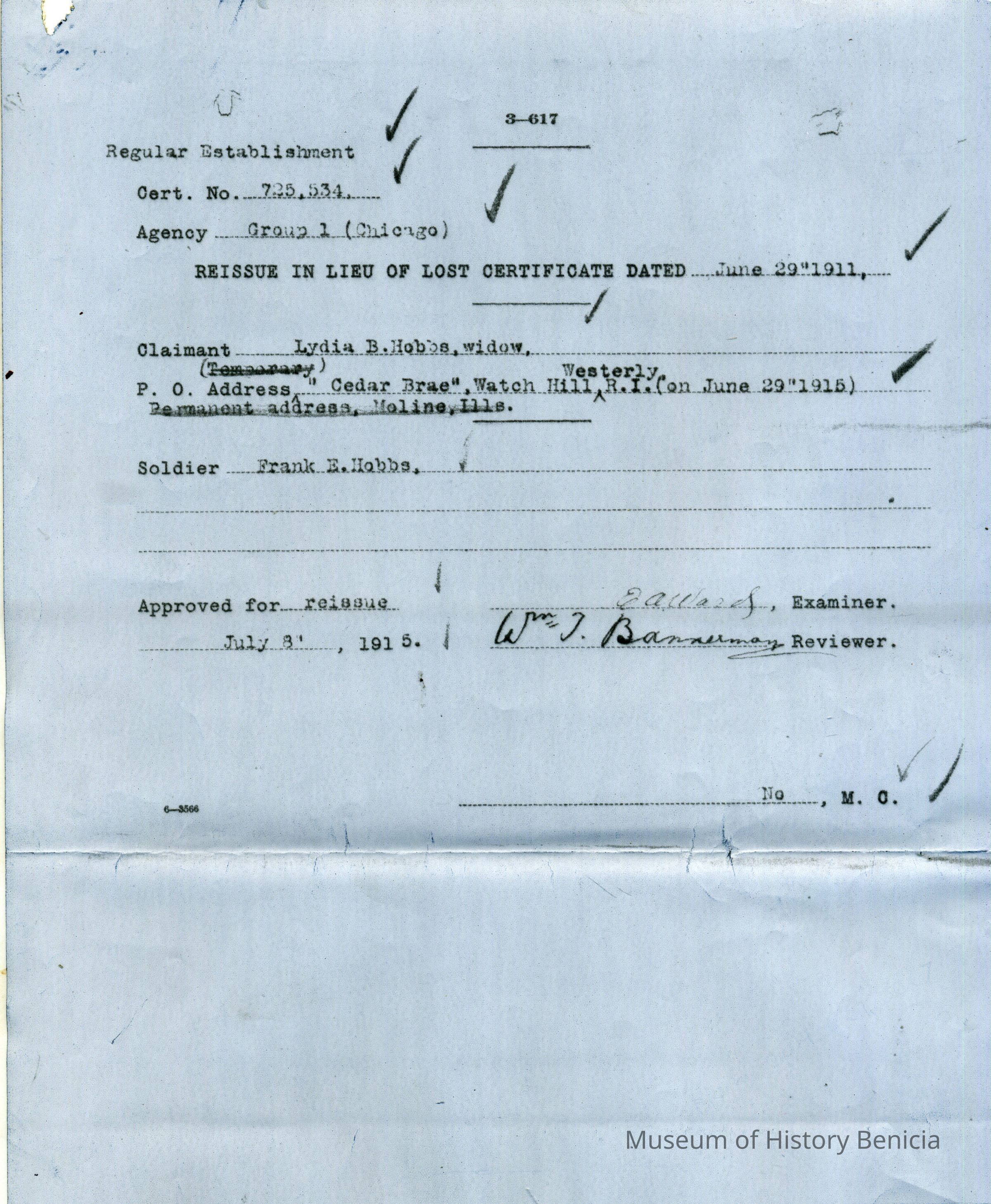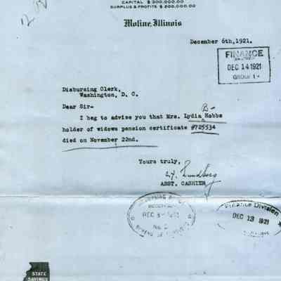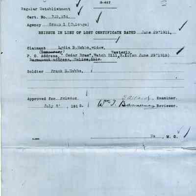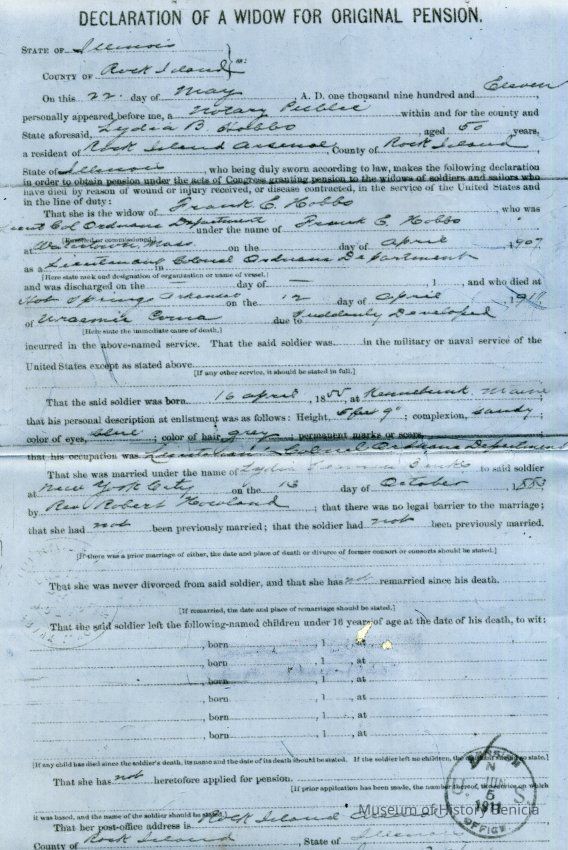 This is an application for Widow's Pension from Lydia B. Hobbs the wife of Frank E. Hobbs a Commander of the Benicia Arsenal 1904-1905. He died 04/12/1911 and she died 11/22/1921.Collection