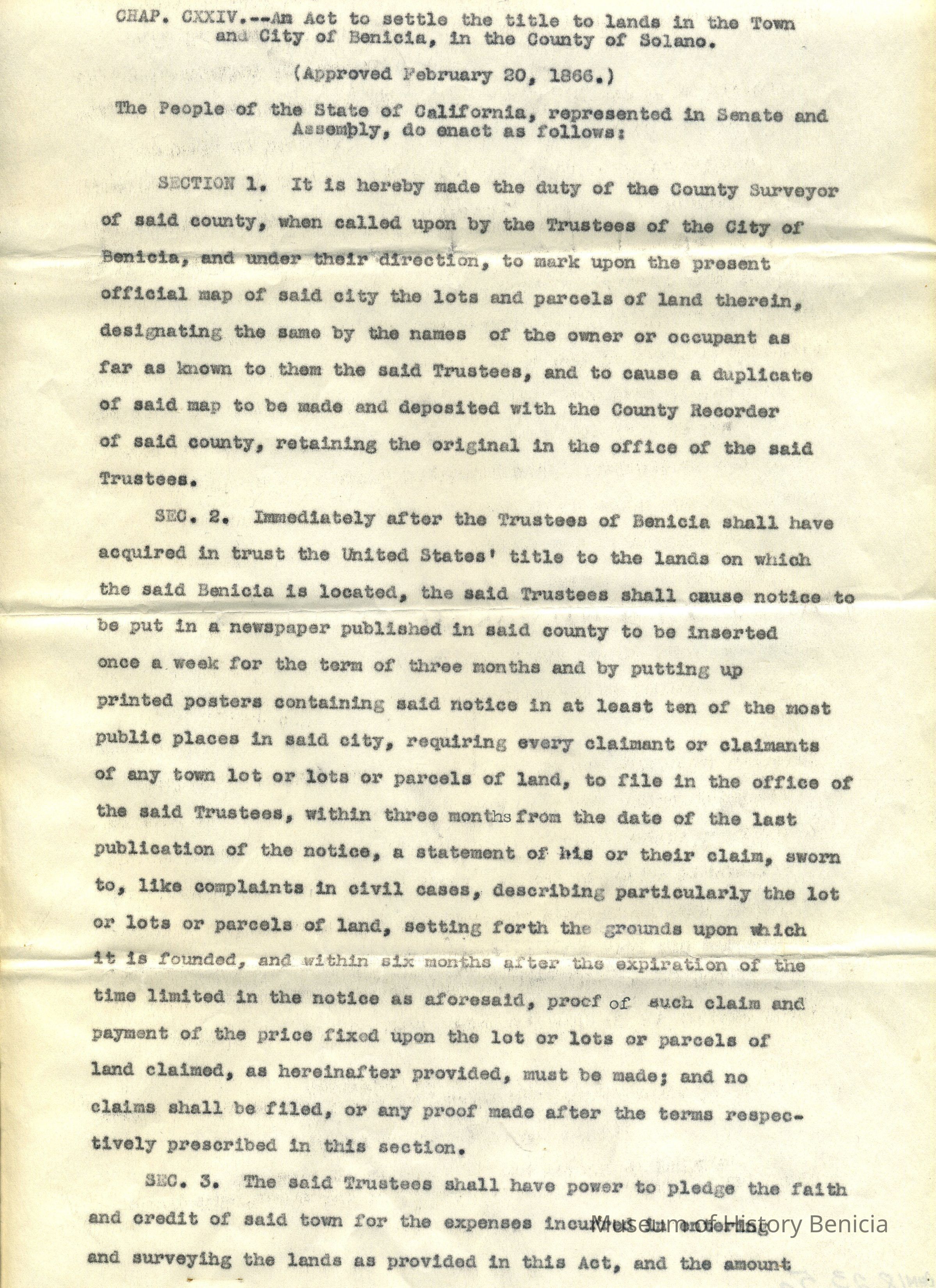 Legal paper regarding an Act to Settle the Title to Lands in the Town and City of Benicia, in the County of Solano.