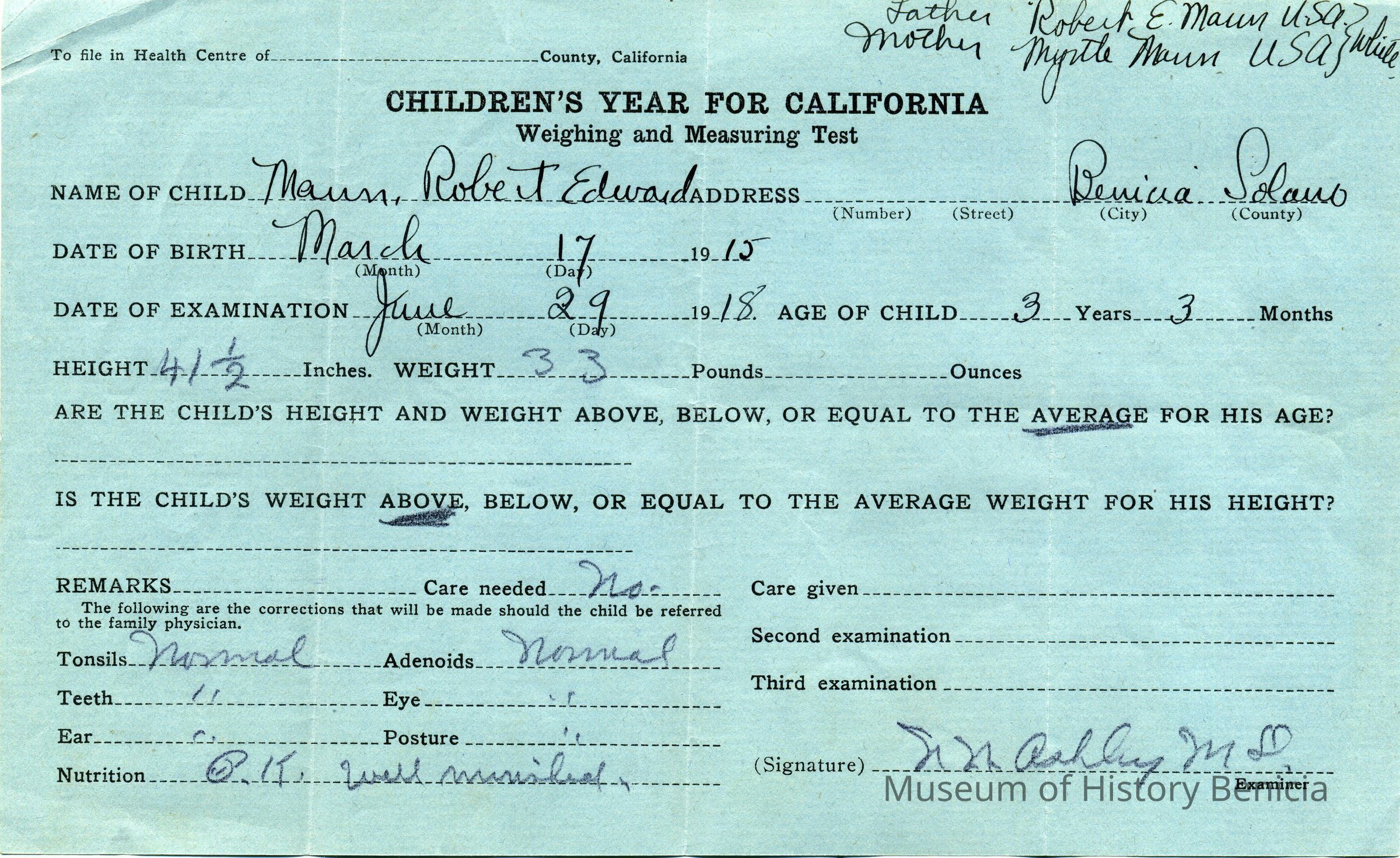 This was a form from the California State Board of Health that was used to gather data for the "Children's Year for california". This was just one area that they were studying having to do with children's health and mortality rates. The results of the study are in the August, 1920 monthly bulletien of the California State Board of Health. The study did not breakout the results by race. That must have been something that the Benicia School district decided to add.Collection