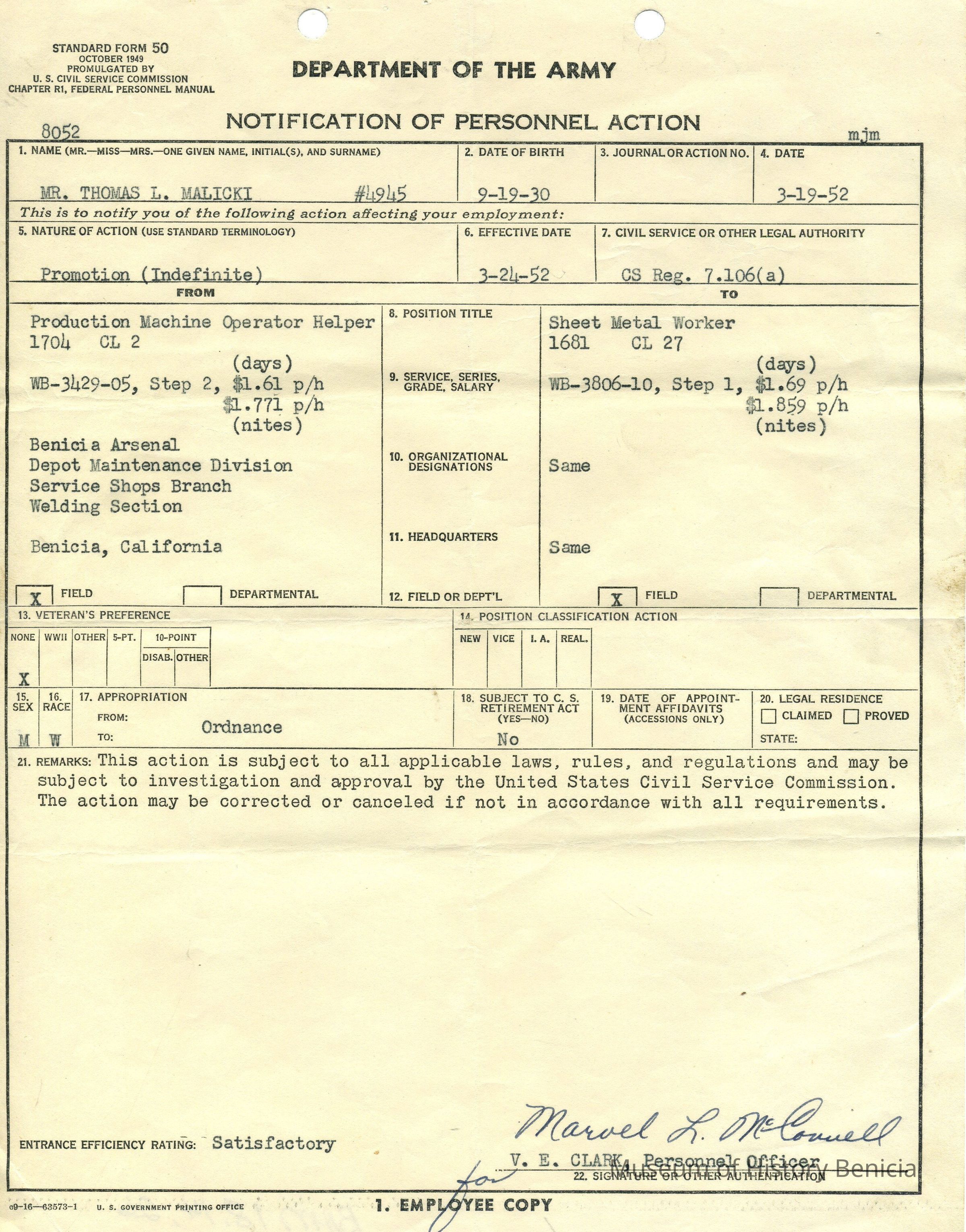 Promotion - Sheet Metal Worker - Benicia Arsenal