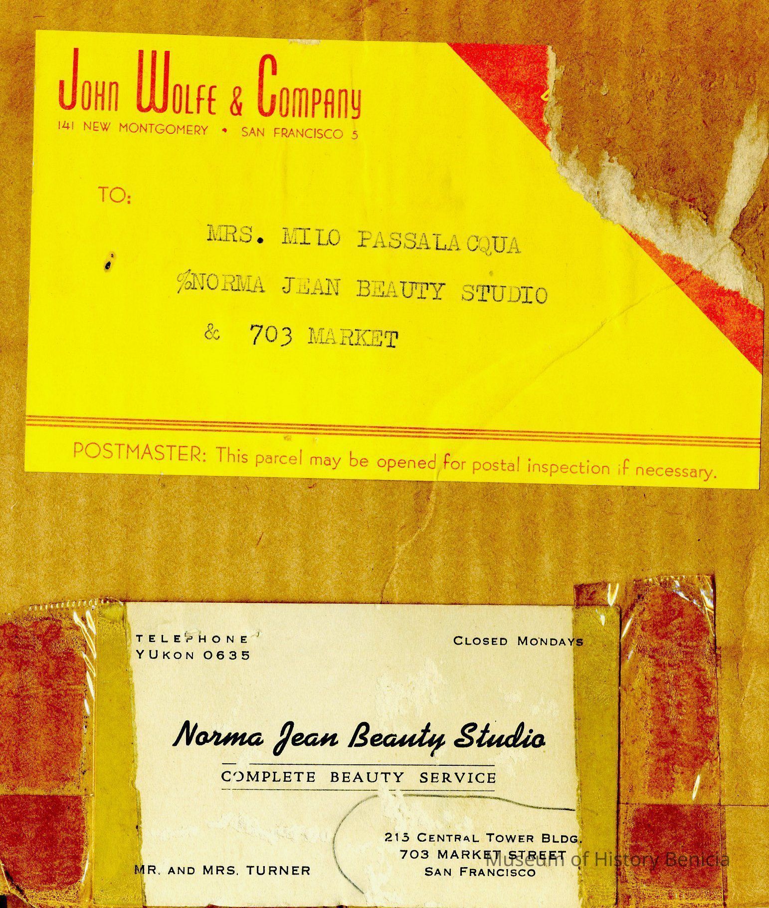 sent to Mrs Milo Passalacqua % Norma Jean Beauty Studio & 703 Market