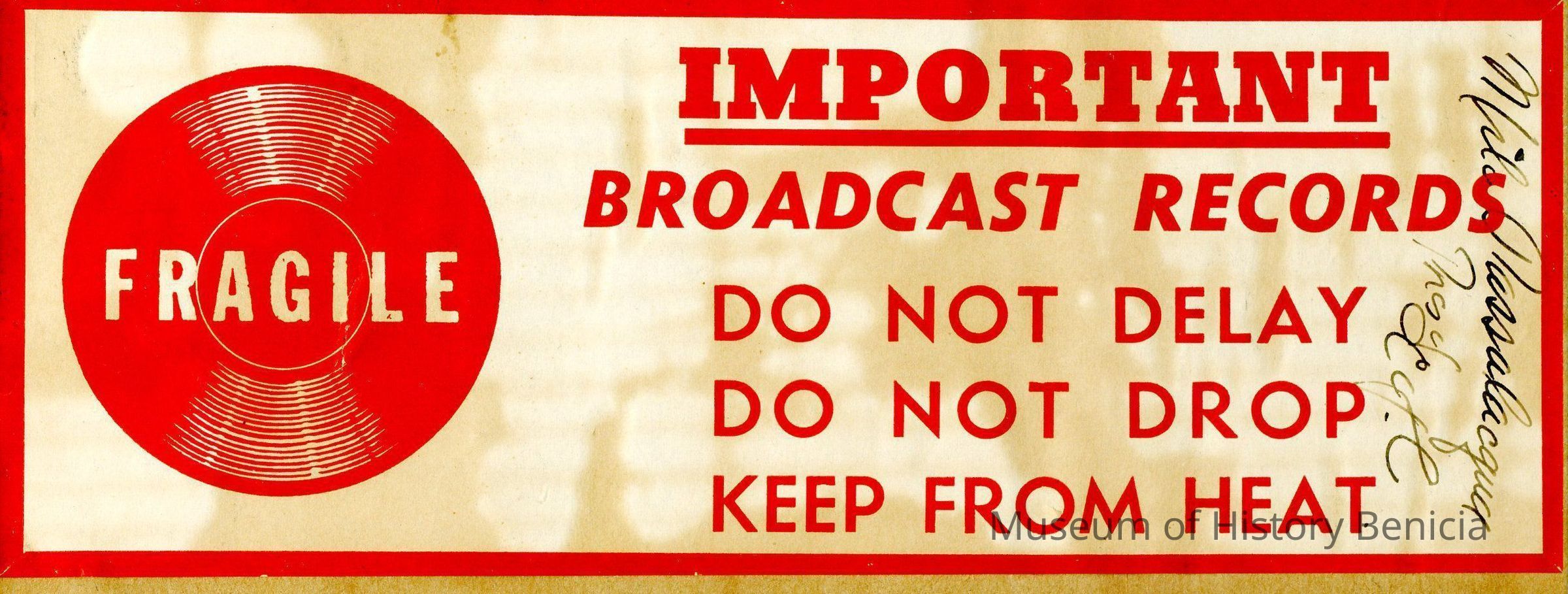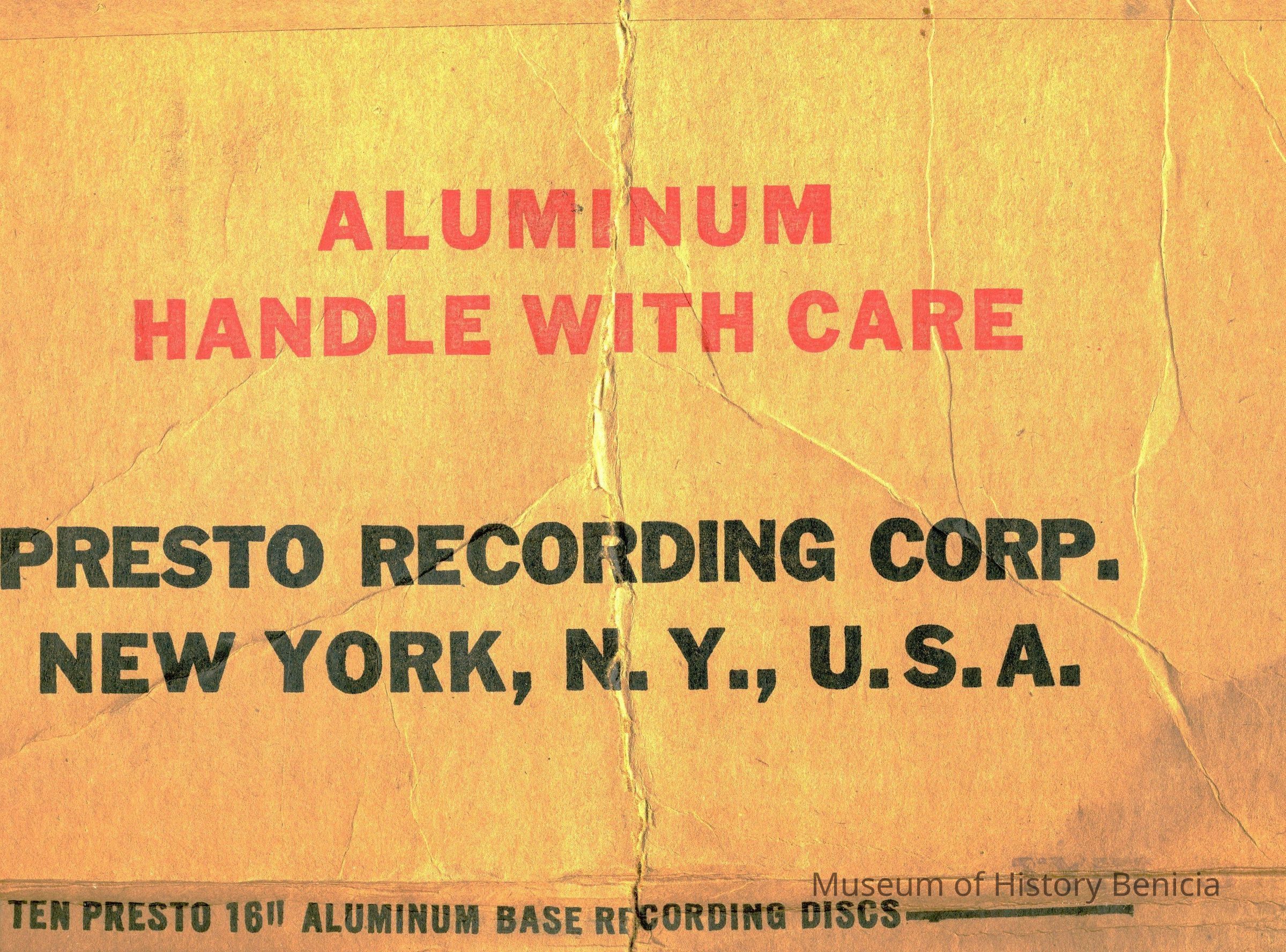 A 16 inch PRESTO aluminium recording disc type B based record of a radio show from 1947. It was originally broadcast on KPO Radio. The title of the broadcast was "Memories of a Pioneer". This episope features long-time Benician Milo Passalaqua".