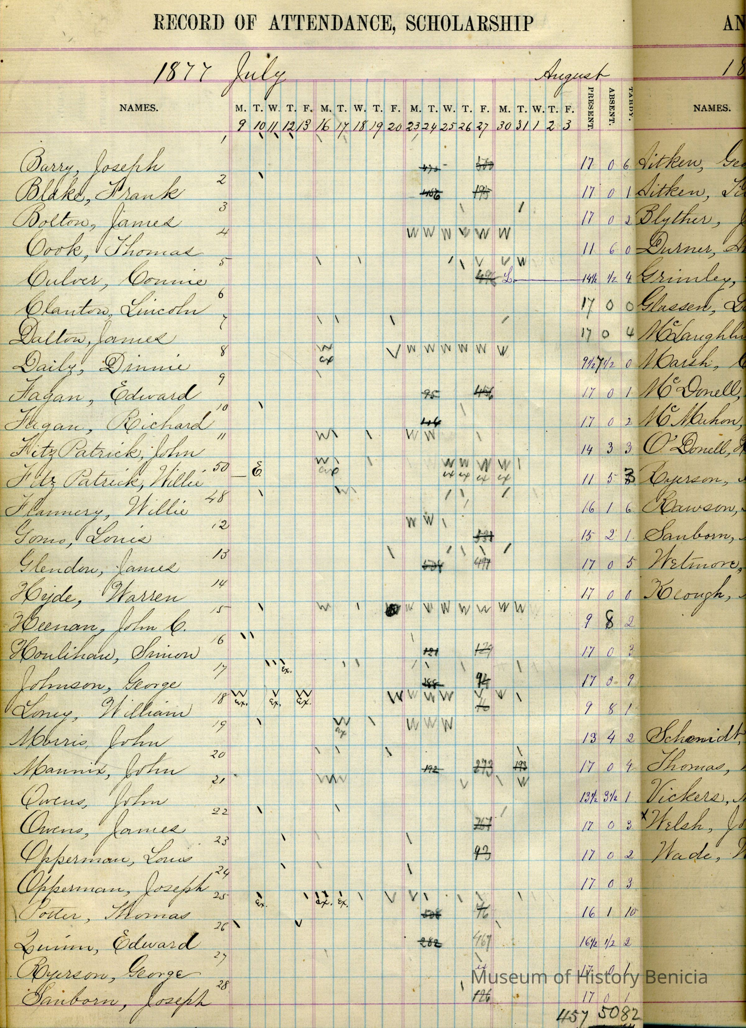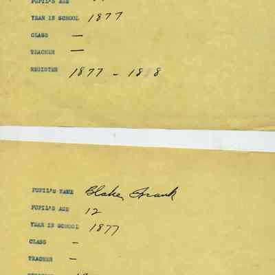 This is the register covering a period from 07/09/1877 to 06/07/1878. The teacher was not listed nor the student ages / grades. There are 59 half sheets in the back of this book listing students name / age / year in school / register.Collection
