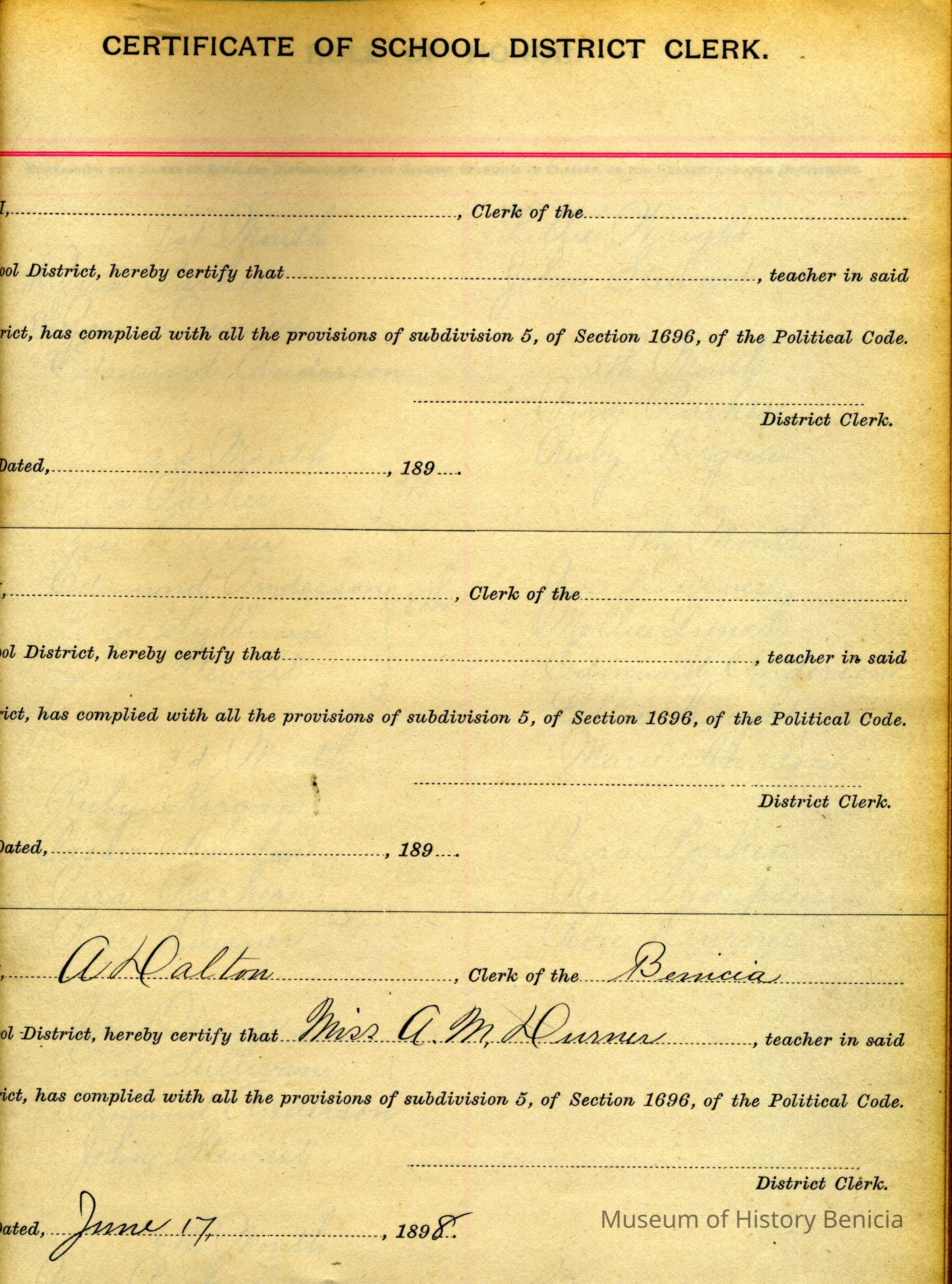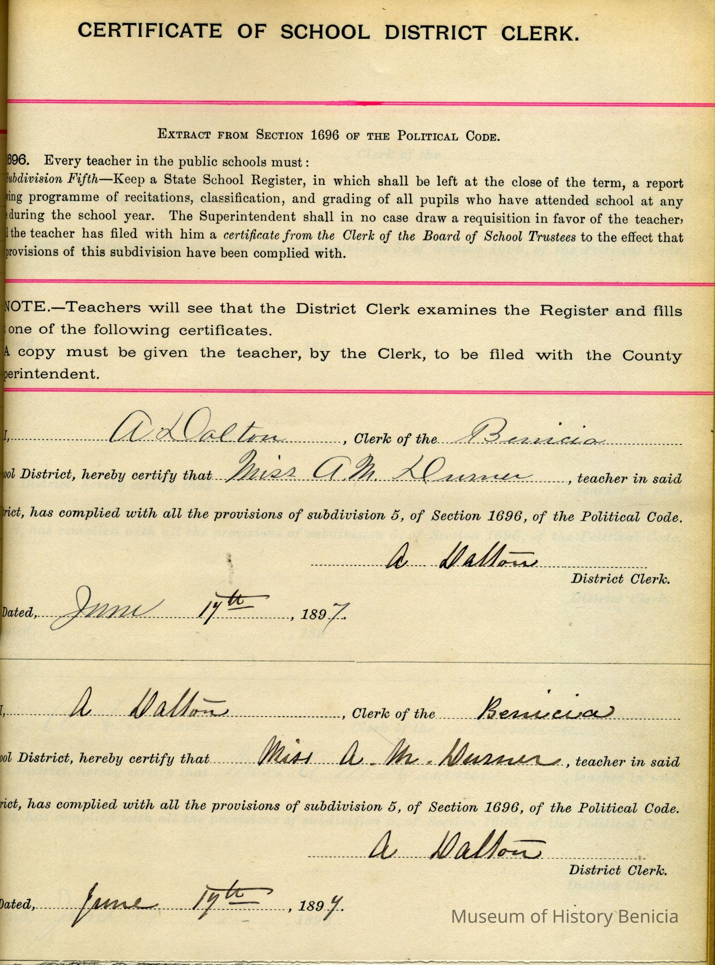 This is the register covering a period from 08/31/1896 to 06/17/1898. The teacher is Miss Anna M. Durner. The school is in Benicia.Collection