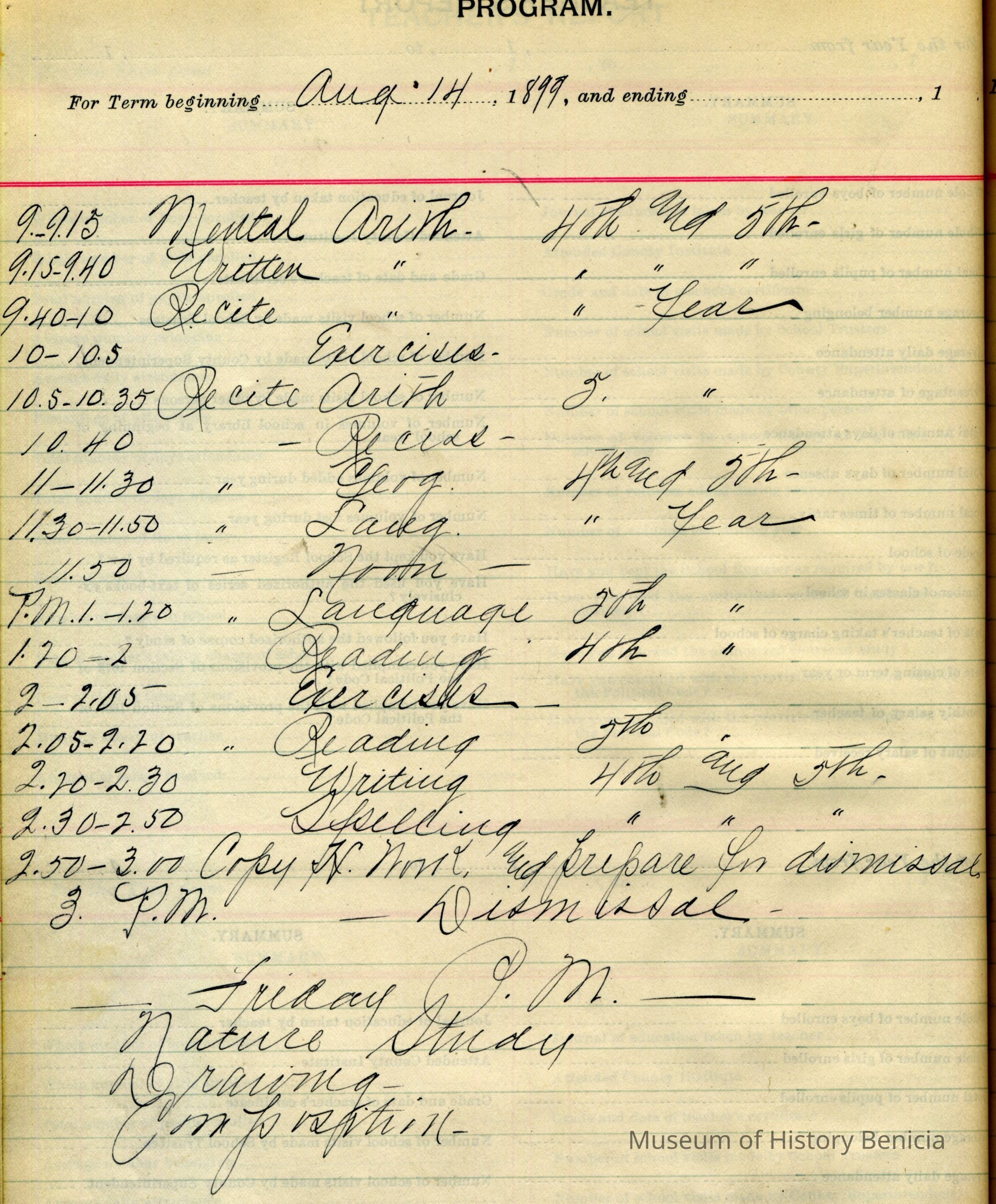 This is the register covering a period from 08/14/1899 to 09/21/1900. The teacher was E.L. Turner. The school is in Benicia. It covers the 4th and 5th grade.Collection