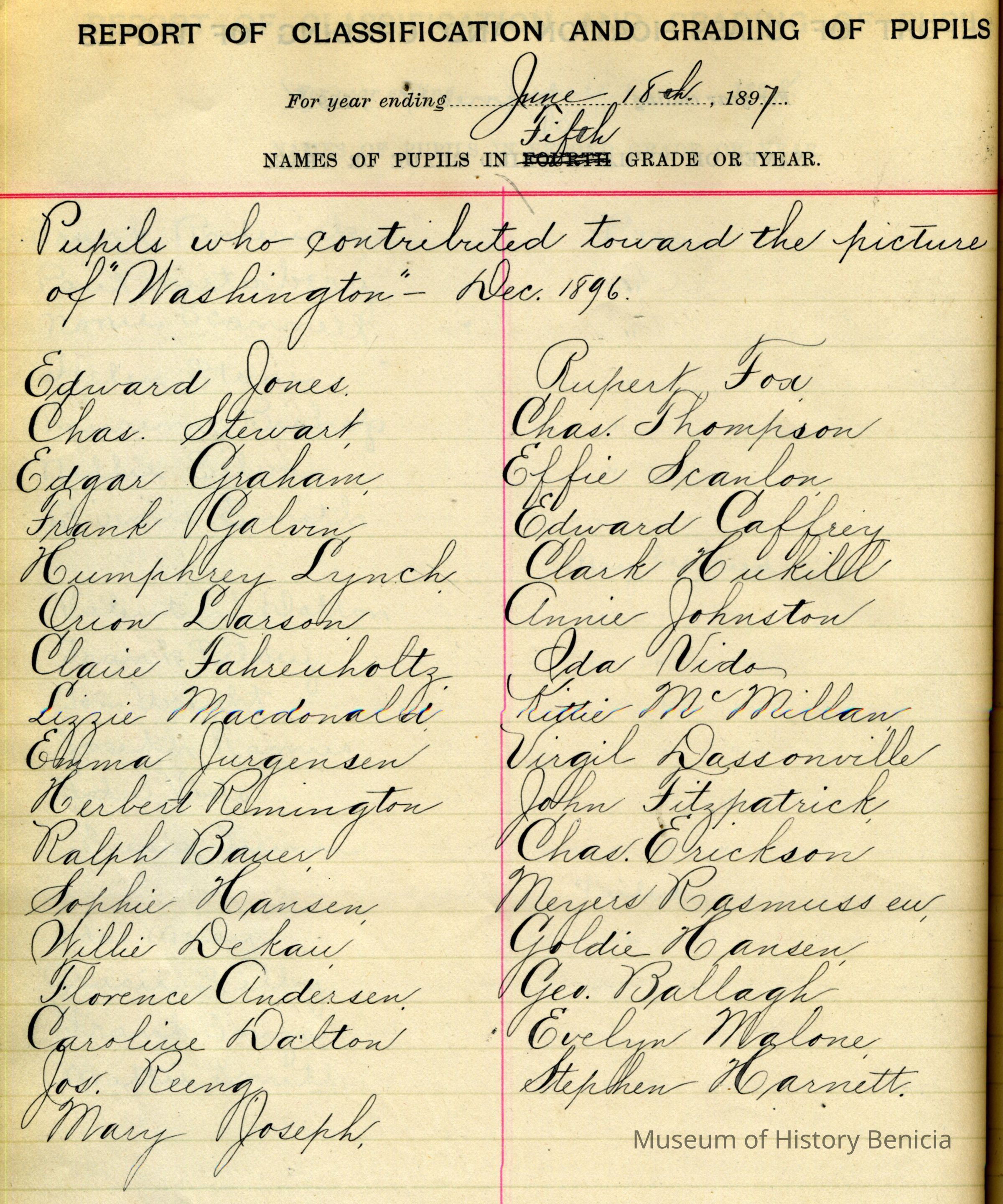 This is the register covering a period from 08/31/1896 to 06/16/1899. The teachers are Miss Sara L. Higby, Miss Tillie R. Durner and Miss Matilda Durner. The school is in Benicia. It covers at least the 5th and 6th grades. It also includes lists of pupils who contributed to buying pictures of Washington (1896) and Ralph Waldo Emerson (1897) and Dewey (1898) for the classroom.Collection