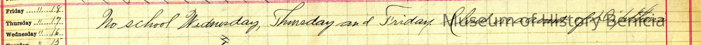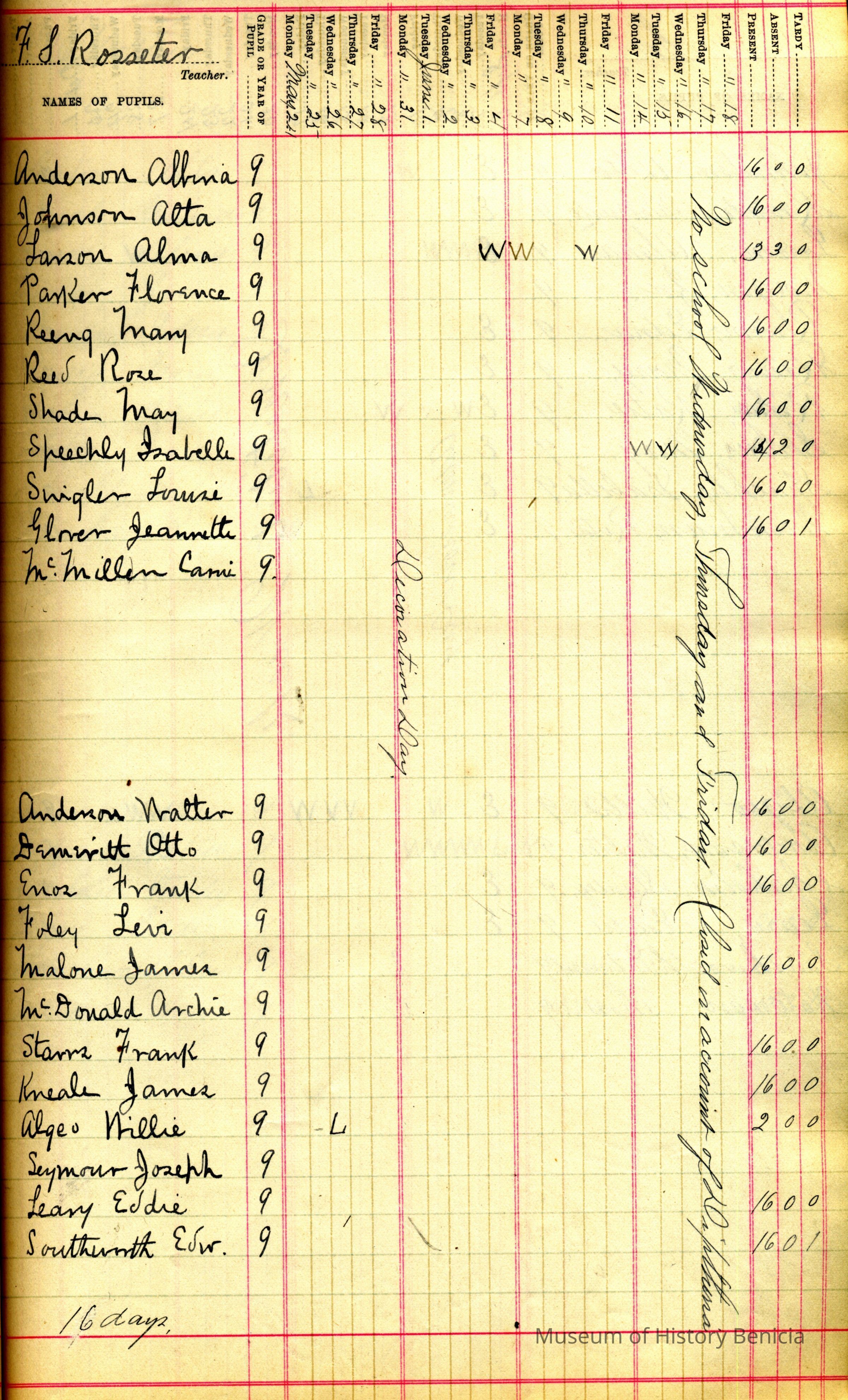 This is the register covering a period from 08/30/1896 to 06/18/1897. The teachers were F.S. Rosseter, Cora M Boone and E H Mosher . The school is in Benicia. It covers at least the 9th grade. In the middle of the book are pages which say they are scholarship records for 1902 and 1903 by Cora M Boone.It also mentions the closing of the school on Wednwsday, Thursday and Friday (06/06/1897 - 06/18/1897) on account of Diptheria.Collection