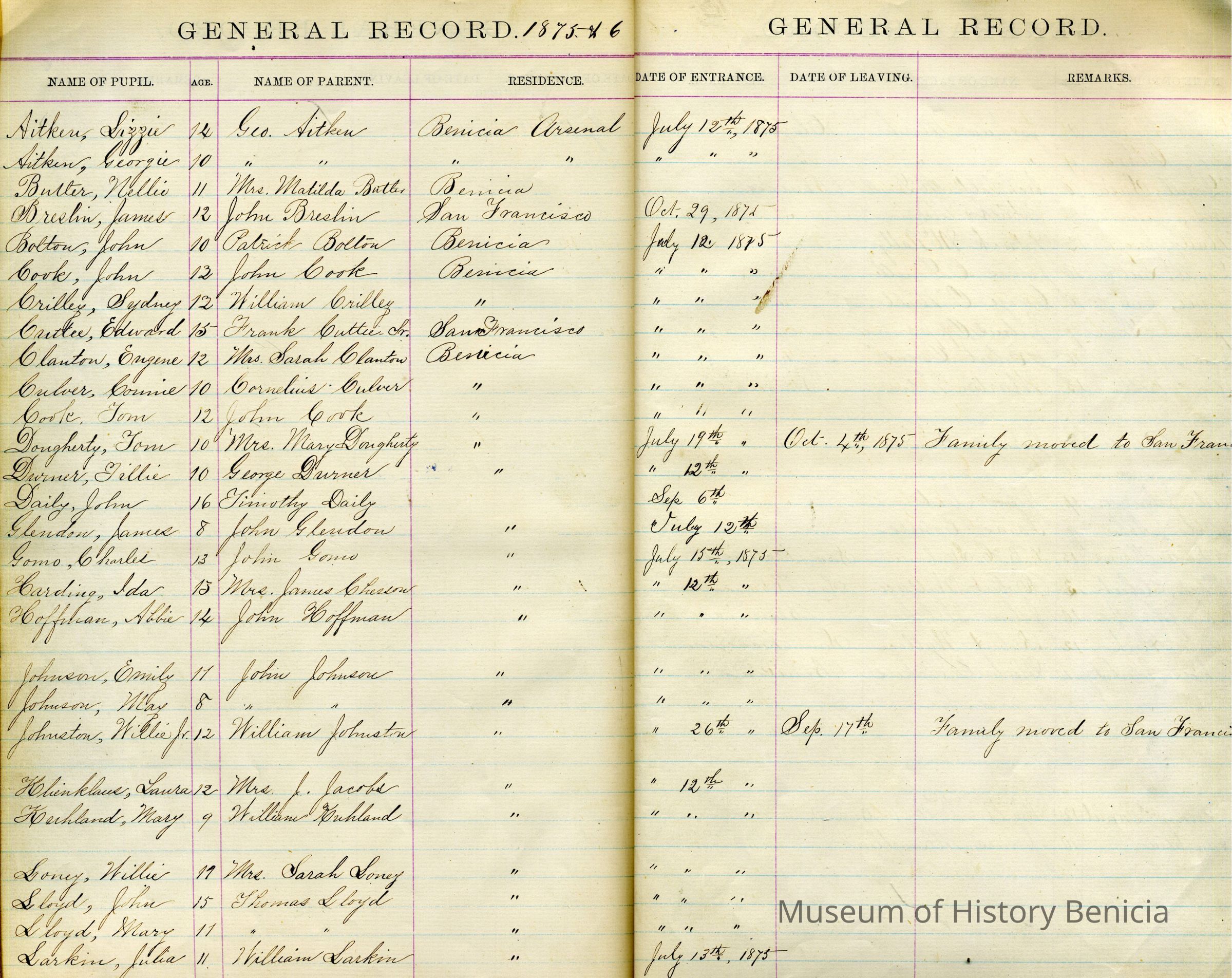 This is the first register covering a period from 07/12/1875 to 08/03/1877. The teacher was Mr. C.D. Bates. He was teaching grades 2 and maybe others.Collection