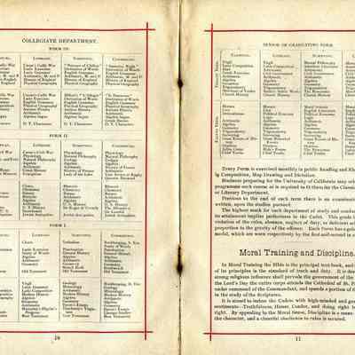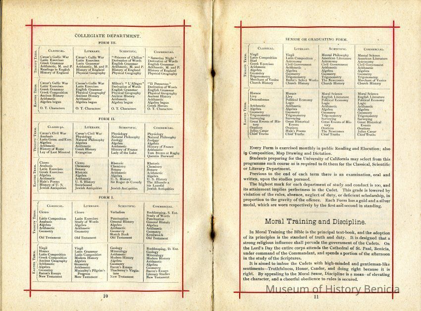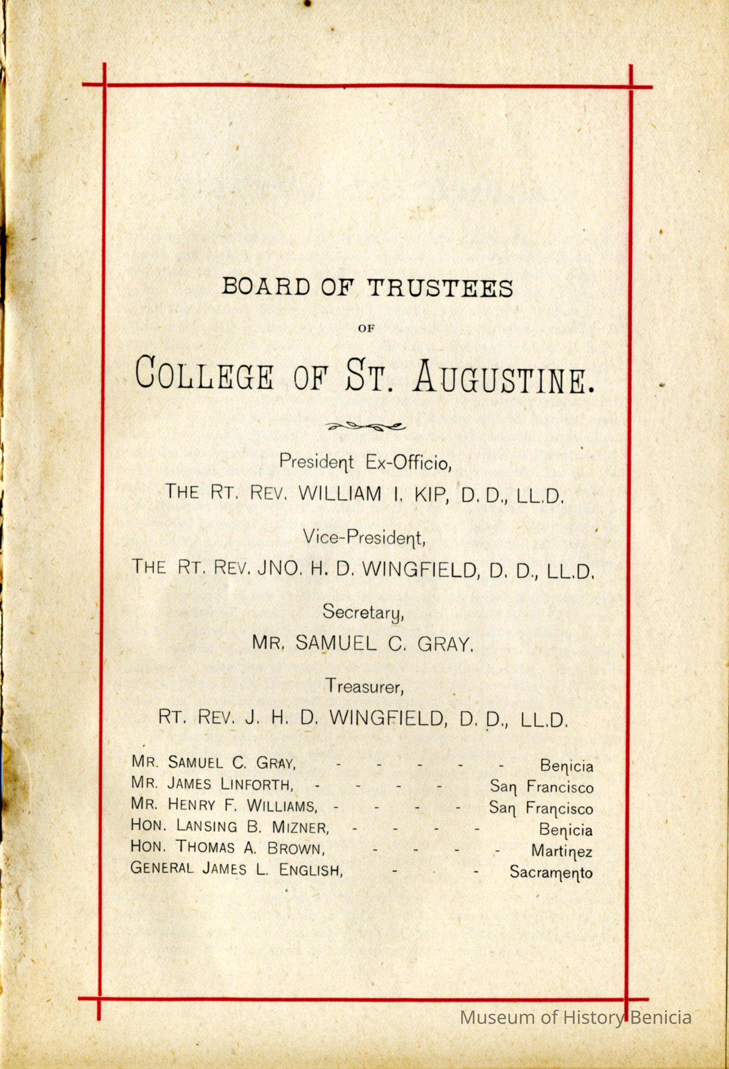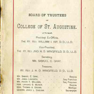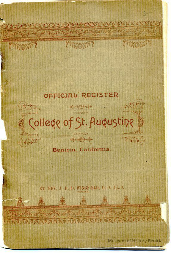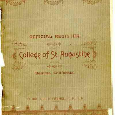 Official register of the College of St. Augustine in Benicia California. The booklet shows general information about the school. It lists the board of trustees which includes Samuel C Gray and Lansing Mizner from Benicia. There are several pages showing a detailed schedule of classes at the school for the grammar school and higher levels. There are several pages showing alumni of the college for 1872 thru 1889.Collection