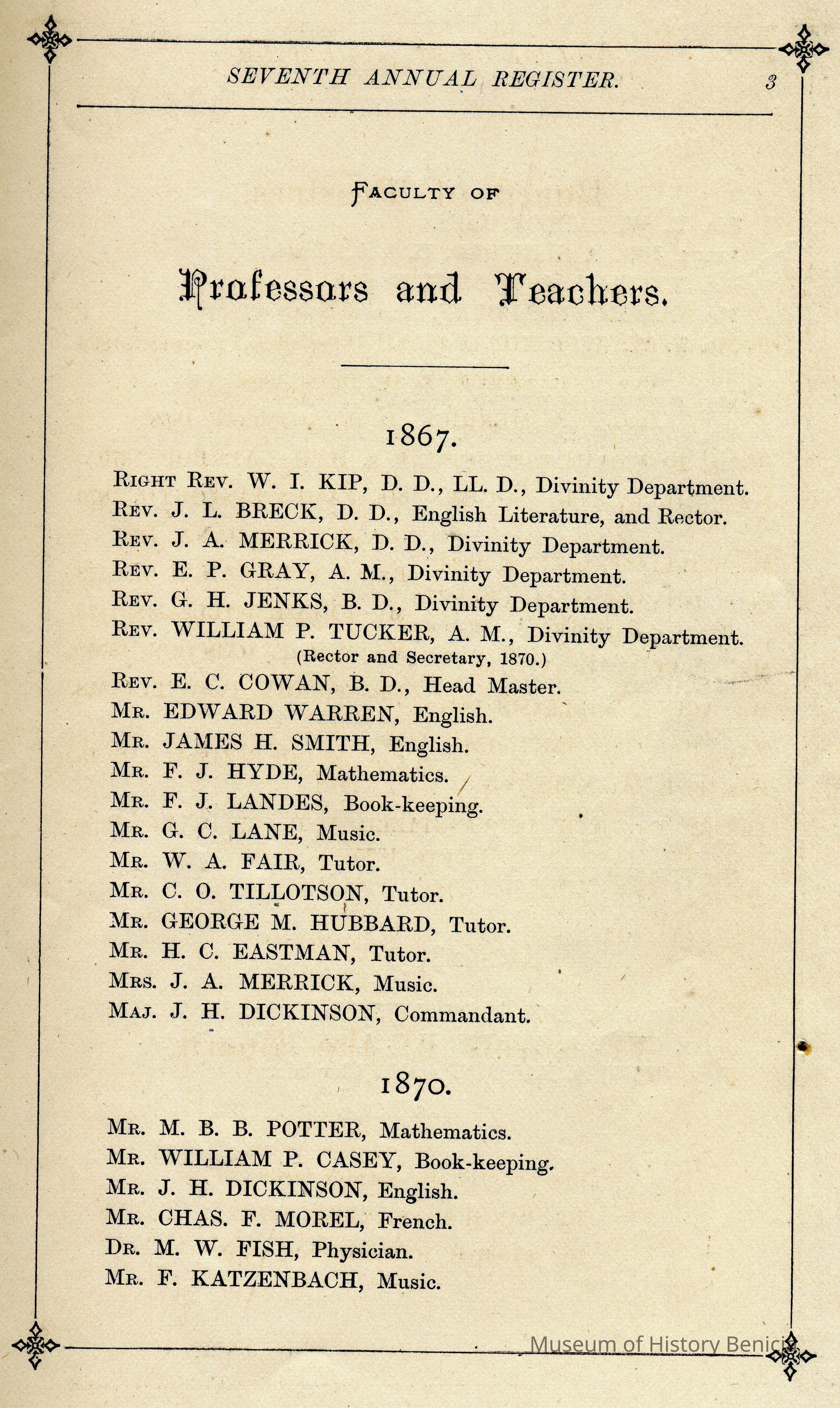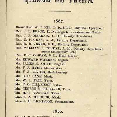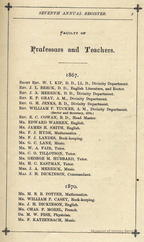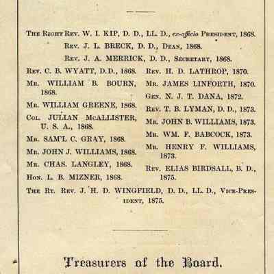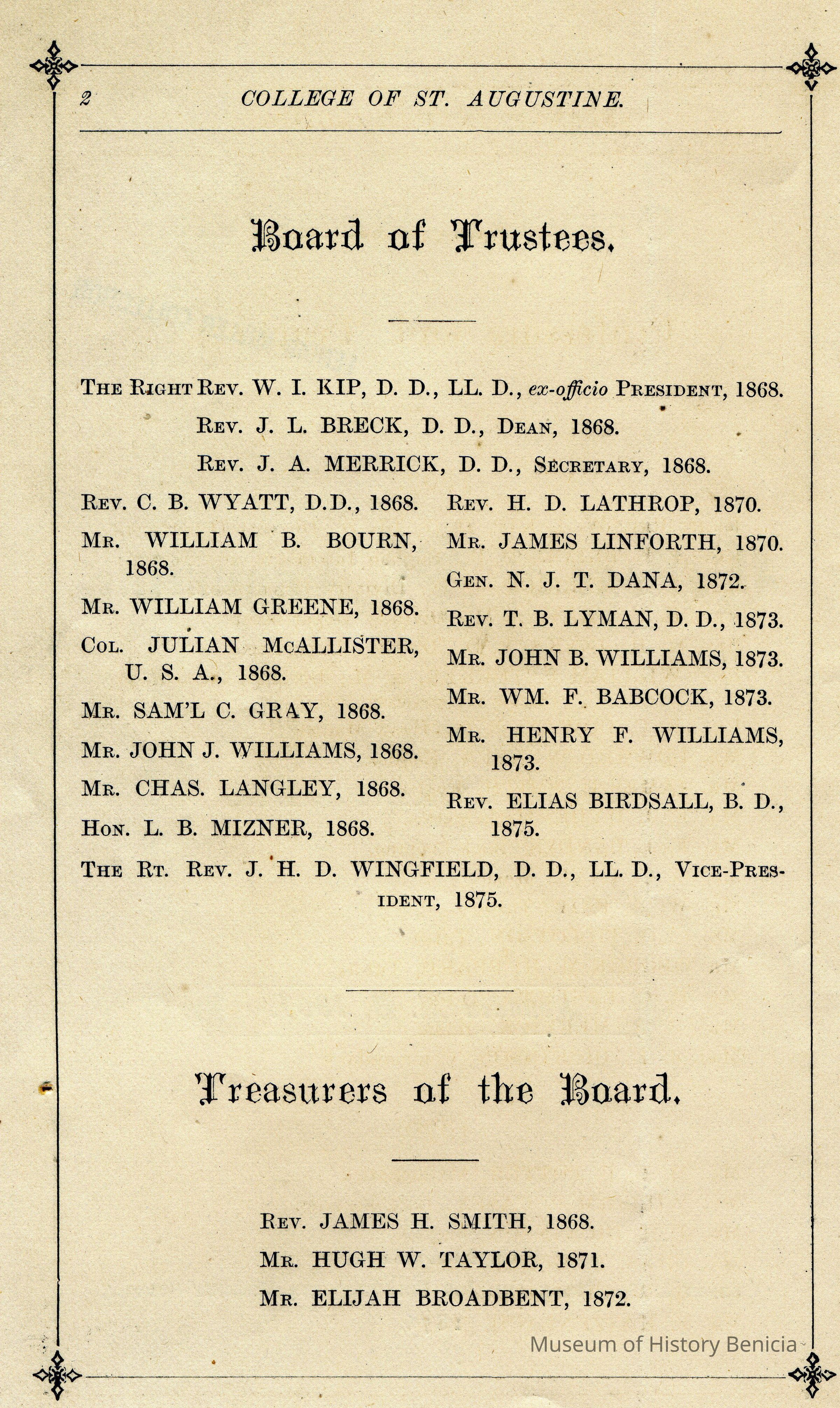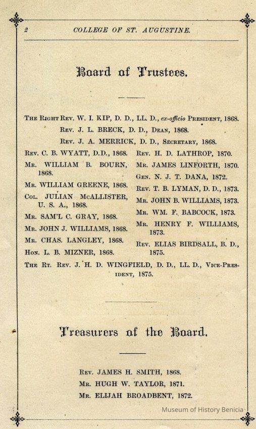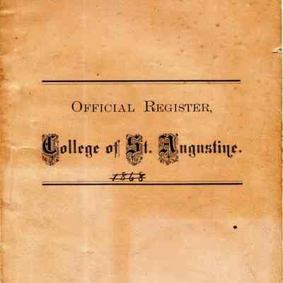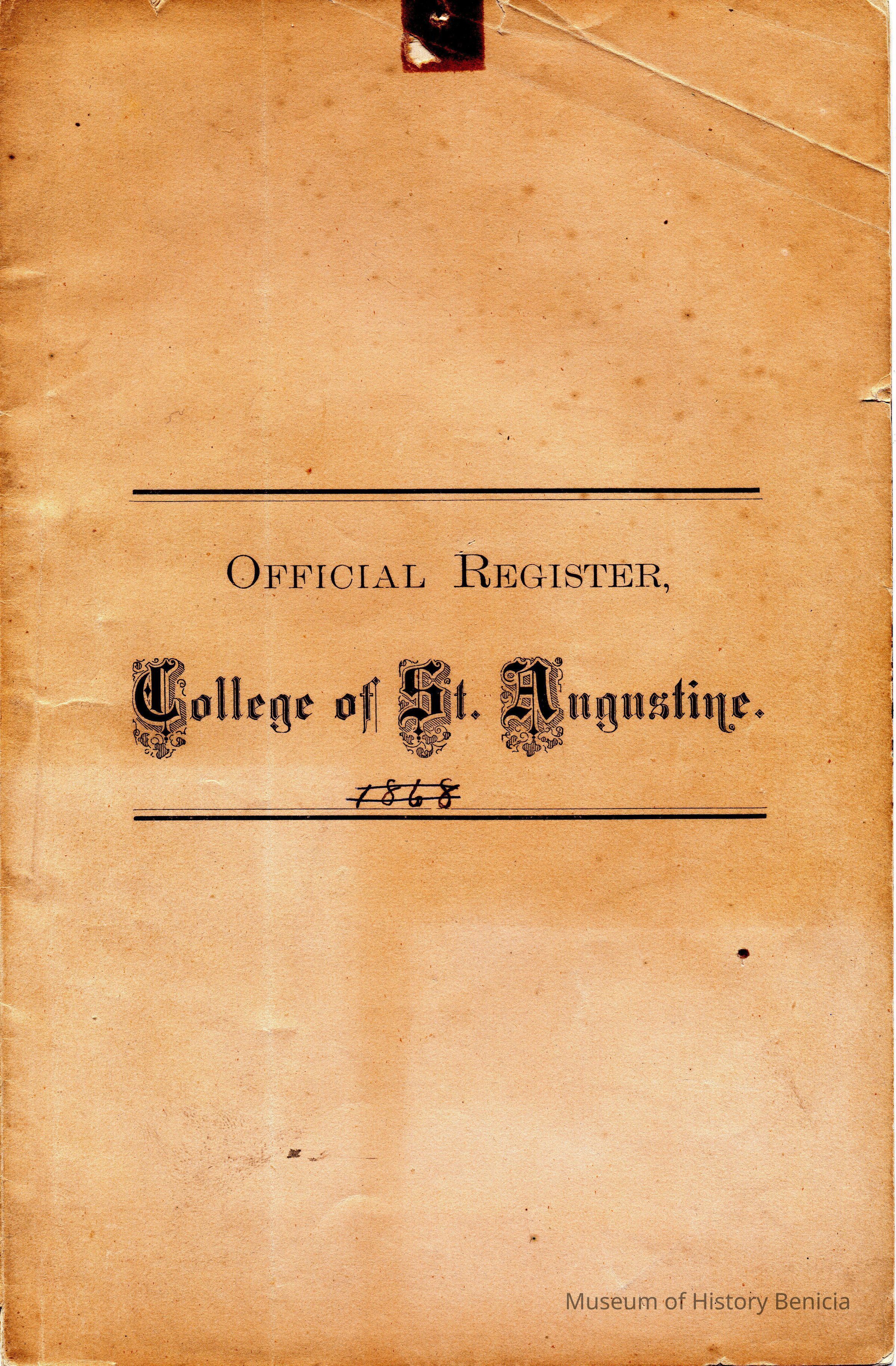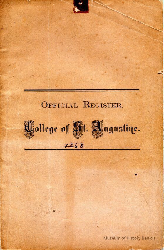 An official register of the College of St. Augustine in Benicia California from 1876. The list of alumni has classes going up to the class of 1875 although there is a page missing after that class.