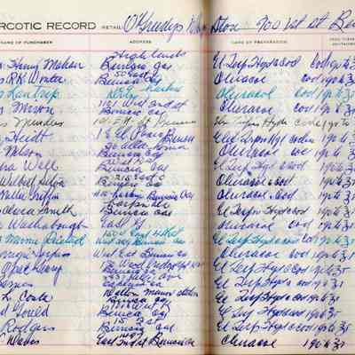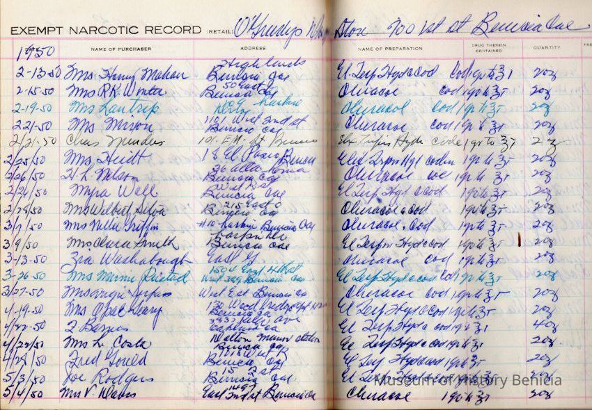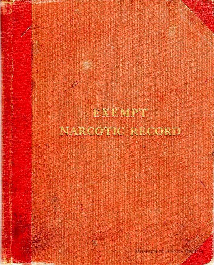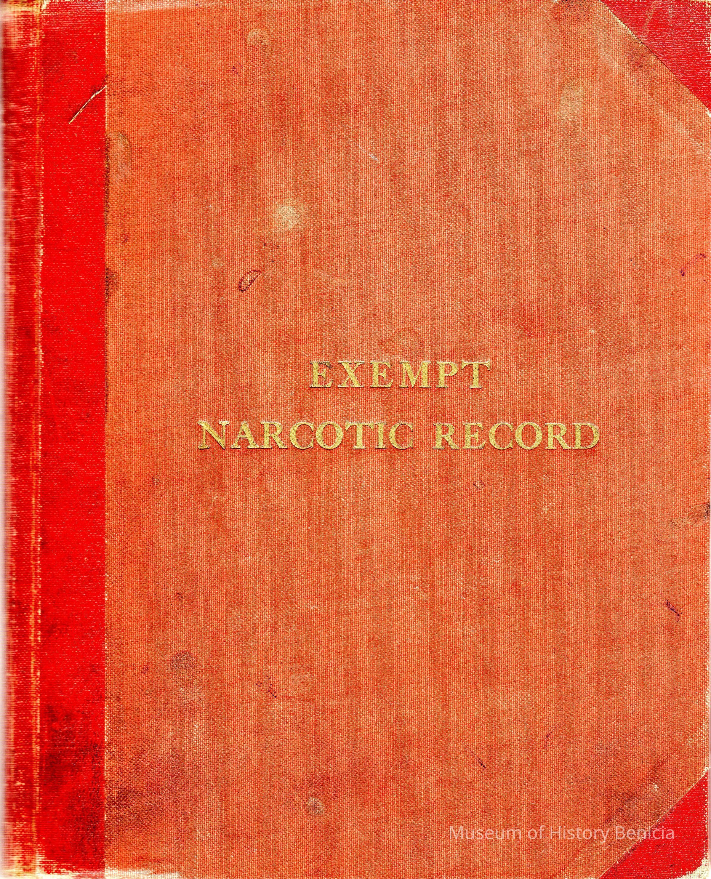 Druggist's Exempt Narcotic Record from Hoffman Pharmacy starting 12/18/1928 to 08/26/1951. The book goes from Hoffman Drugs to O'Grady Drugs to just "Drug Store700 1st Benicia, Cal.Collection