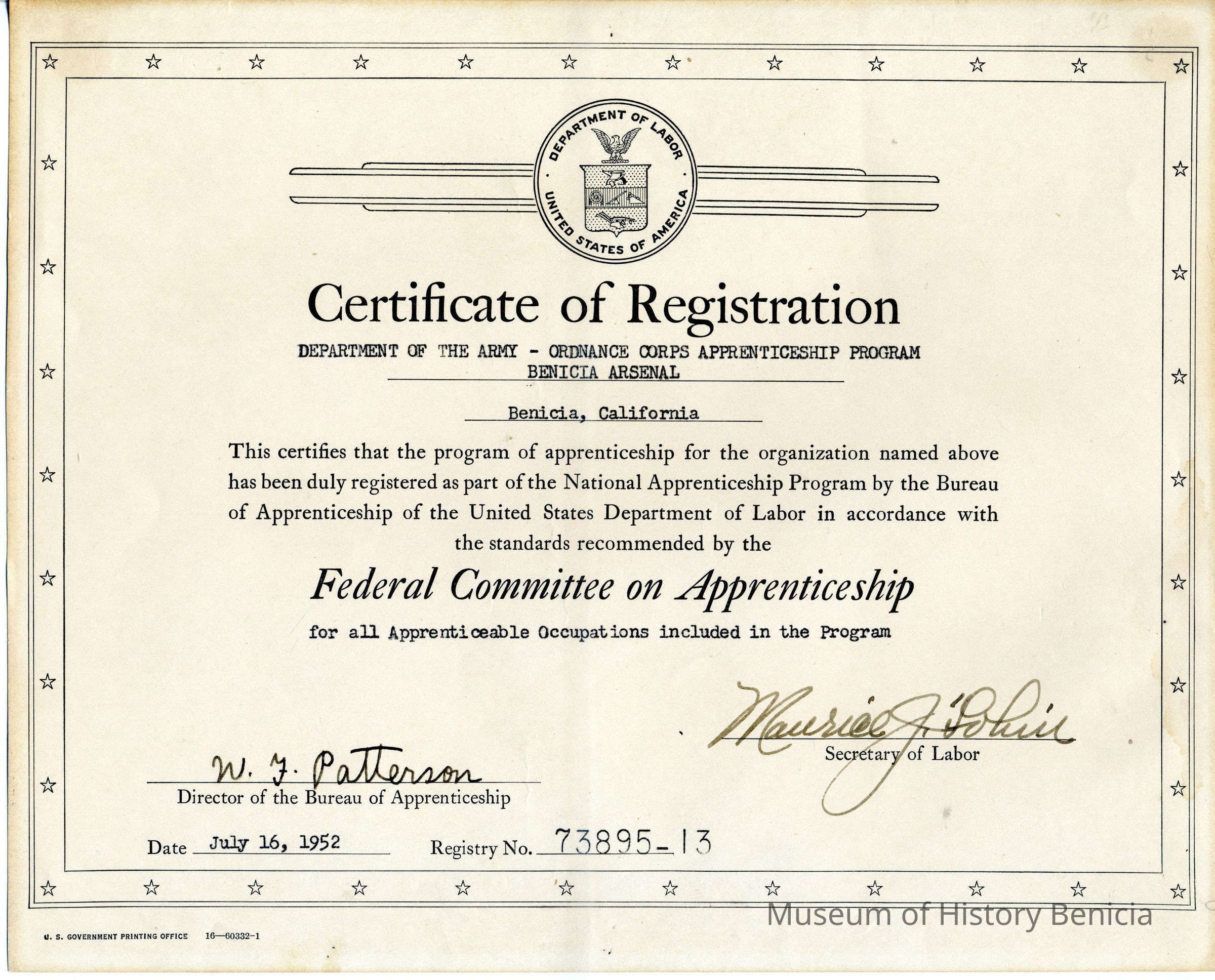 Signed by W. F. Patterson, Director of the Bureau of Apprenticeship