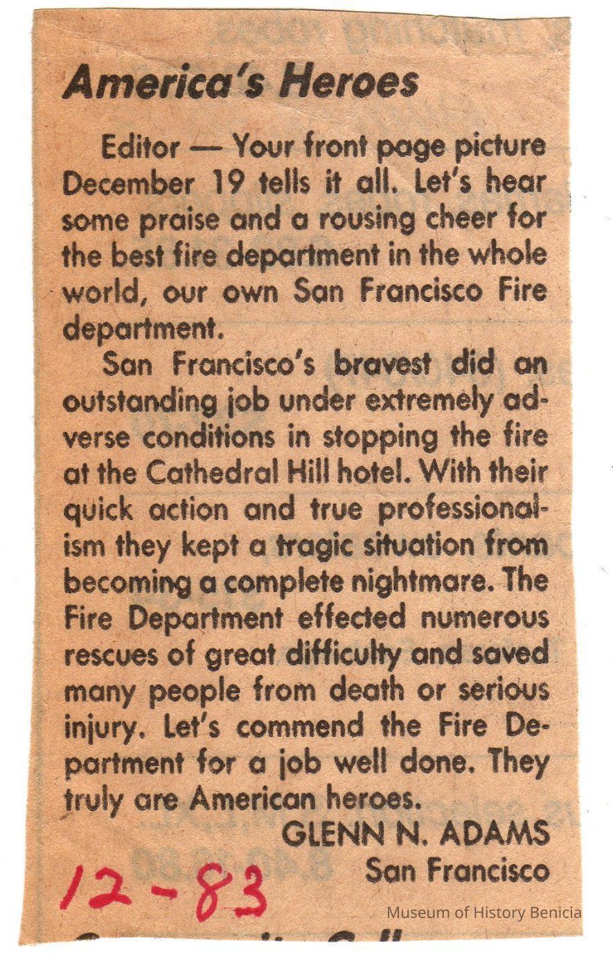 in support of the S.F. Fire Department in their efforts with the fire at the Cathedral Hill Hotel.