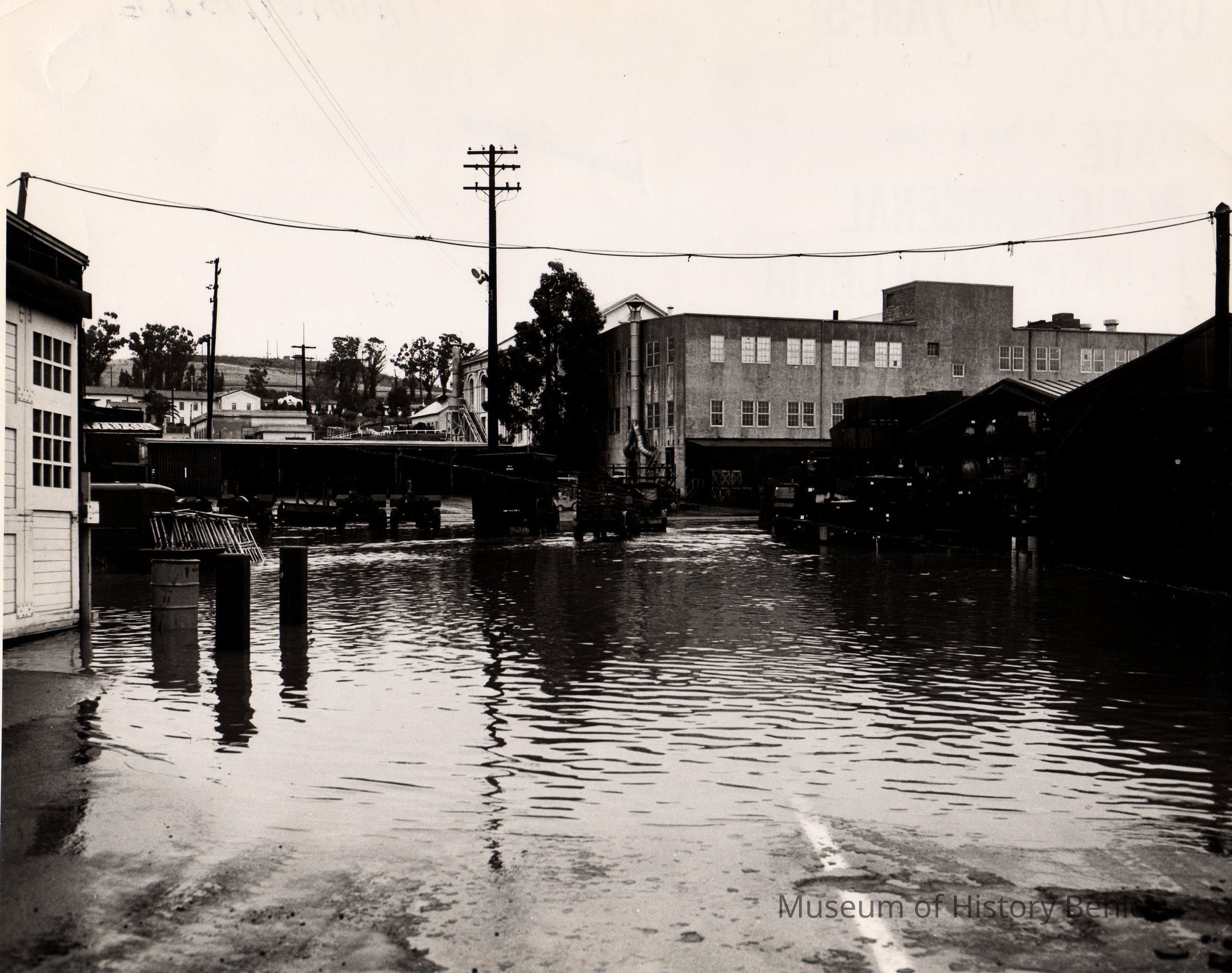 B/W photograph of Arsenal Buildings No. 56-A at right and carpenter's shop at left; area is flooded