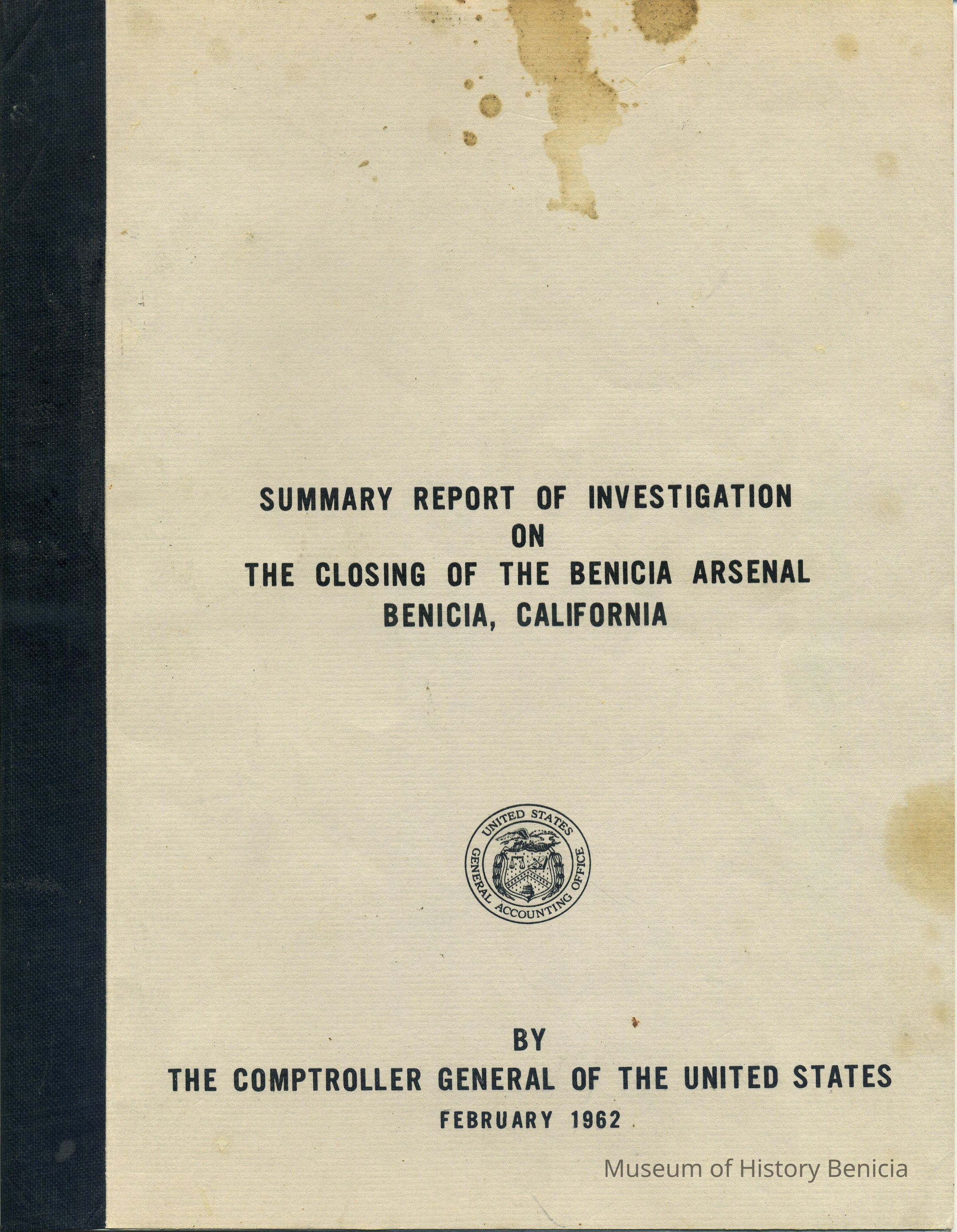 Booklet "Summary Report of Investigation on the Closing of the Benicia Arsenal, Benicia, California" by the Comptroller General of the United States, February 1962,