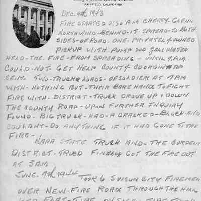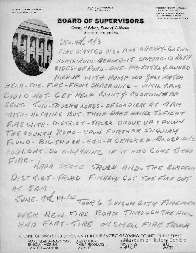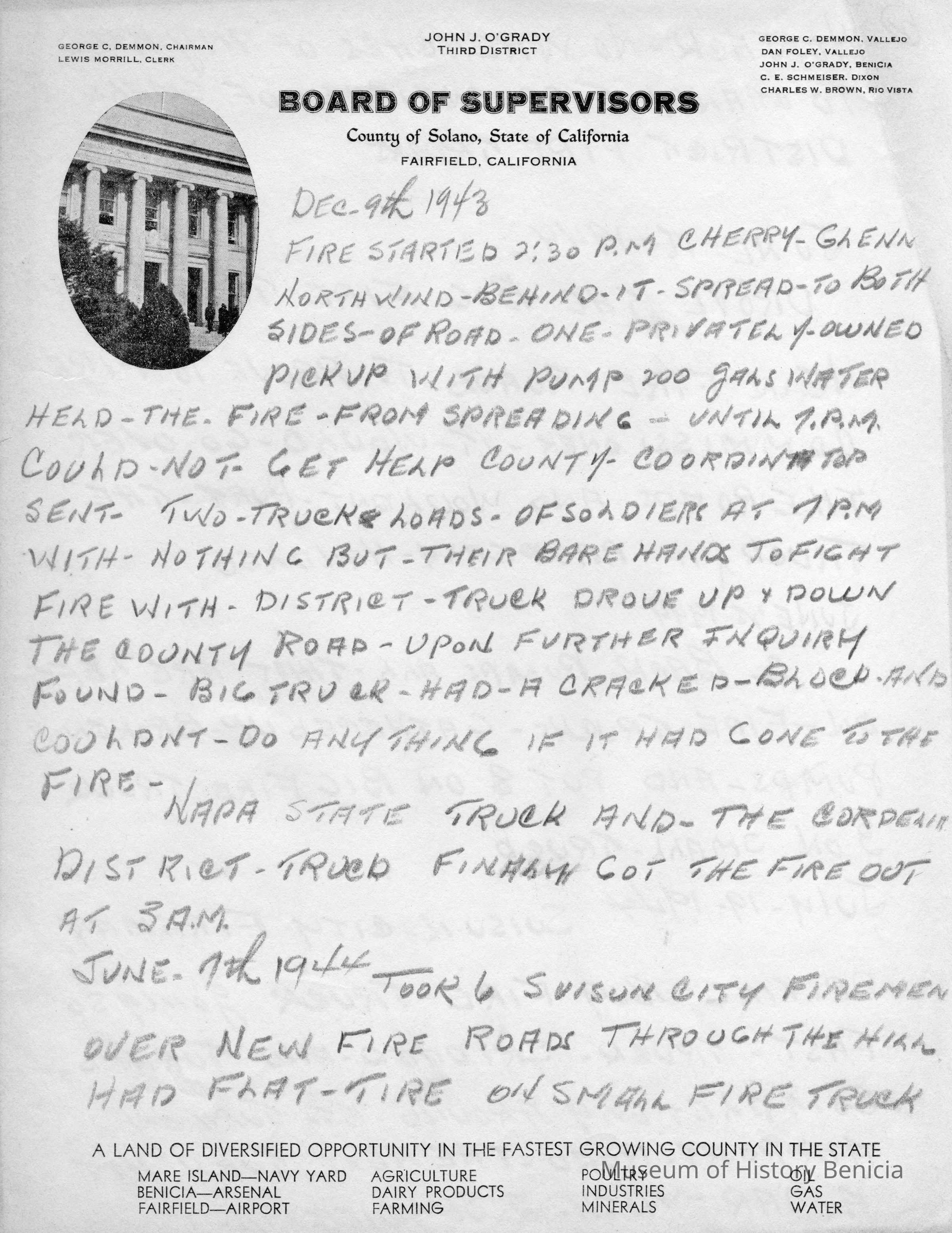 Solano County Board of Supervisors paper with notes on a fire and the response. Dated 12/09/1943. Fire was in Cherry Glenn.