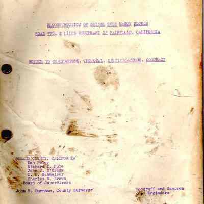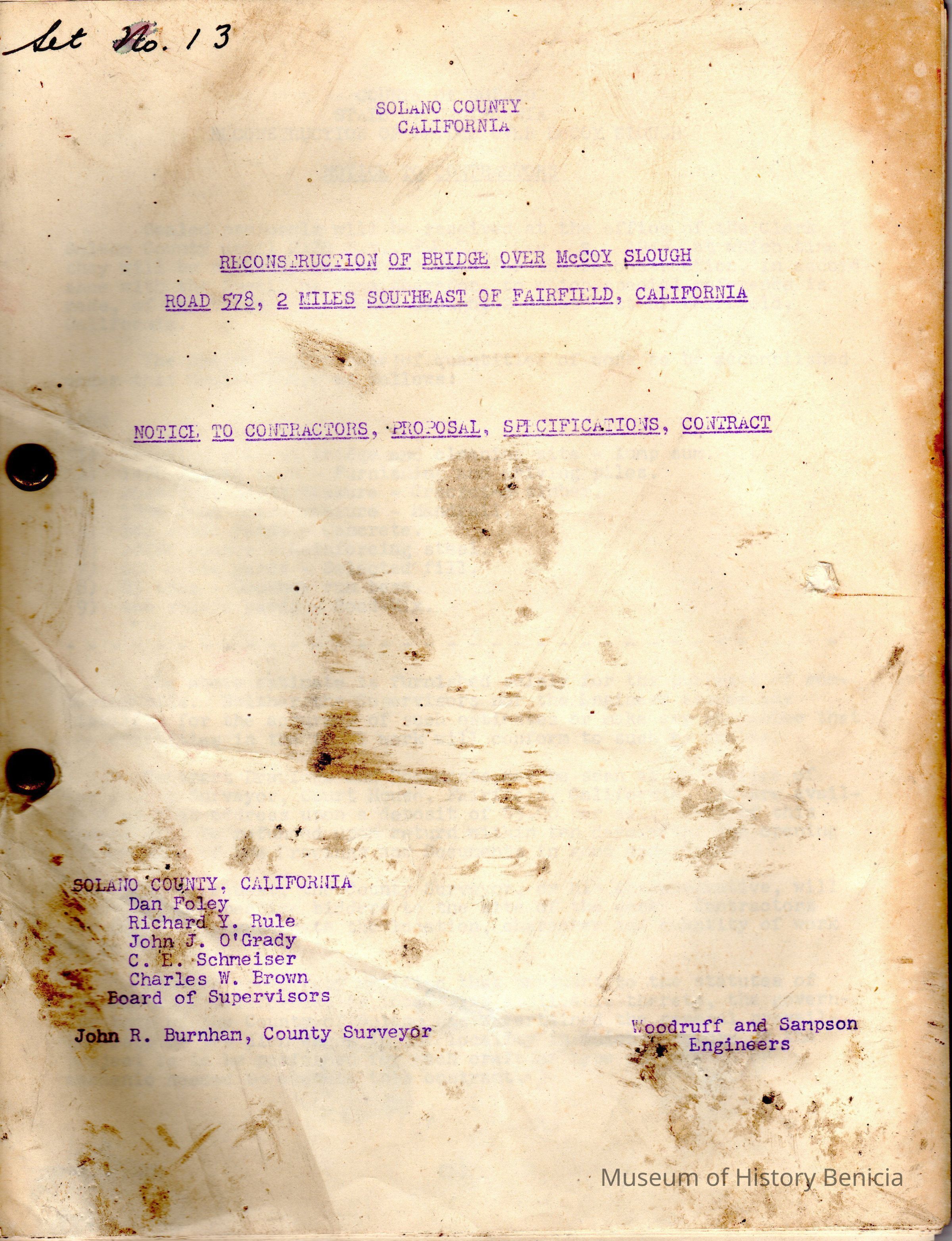 Solano County Notice to Contractors for bids to reconstruct the bridge over McCoy Slough Dated 05/07/1945. This is a numbered document - Set No 13.Collection