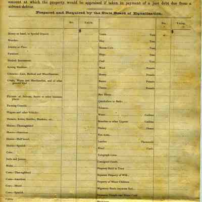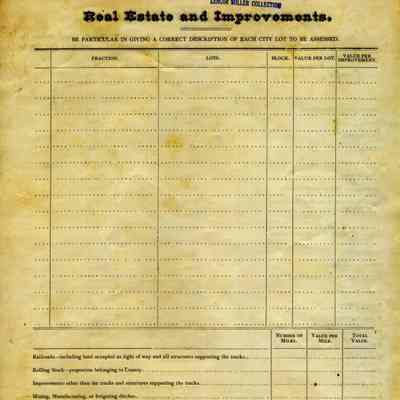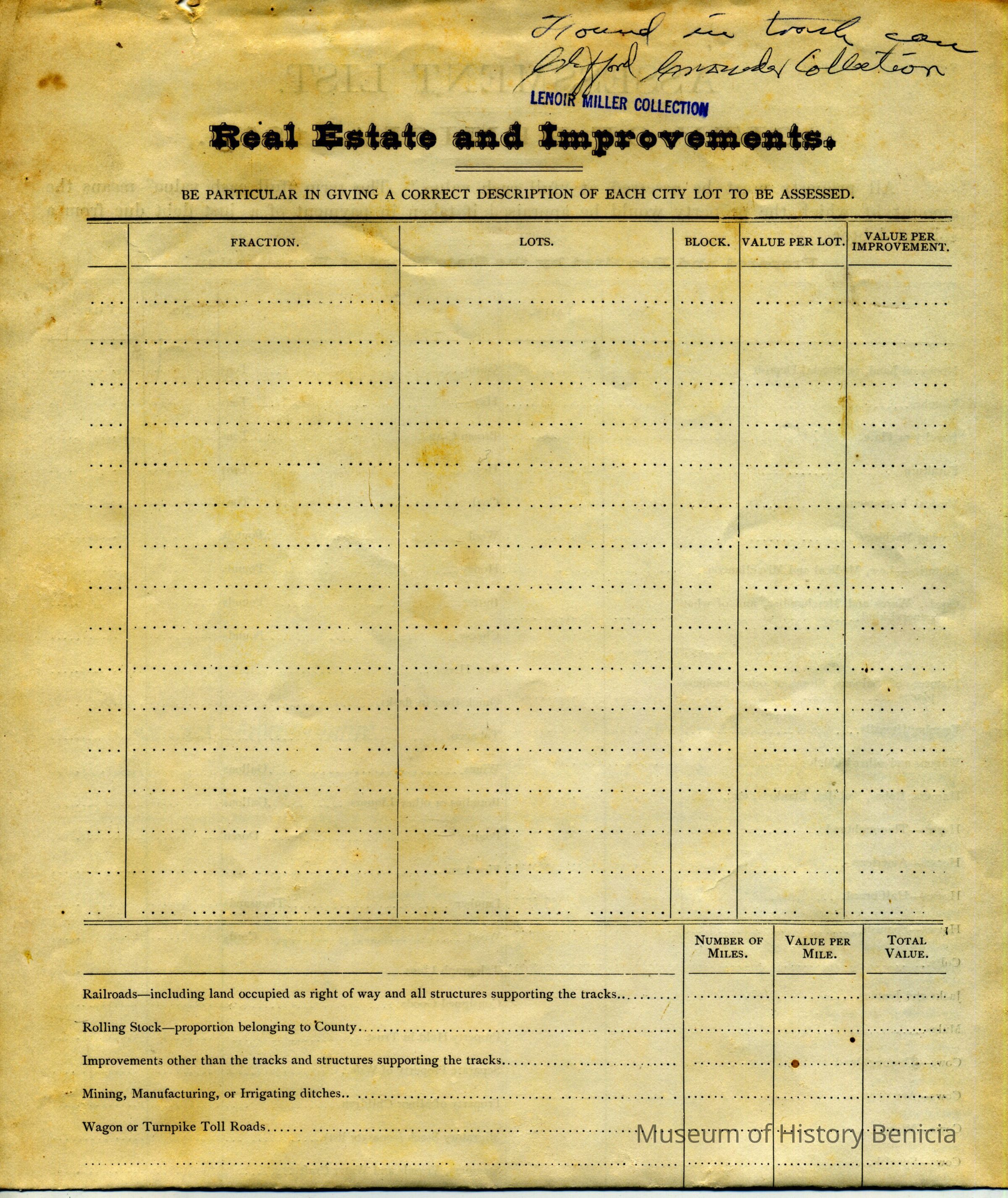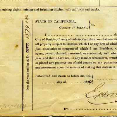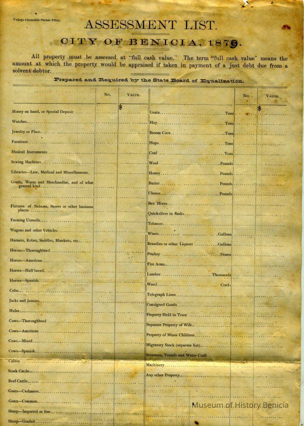 This is a blank assessment form for the City of Benicia in 1879. It is designed to list all of the property someone has and its value so it can be assessed by the Board of Equalization. The list of property is blank but the person for whom this was intended is Edgar Robbins for the year 1879 & 80.Collection