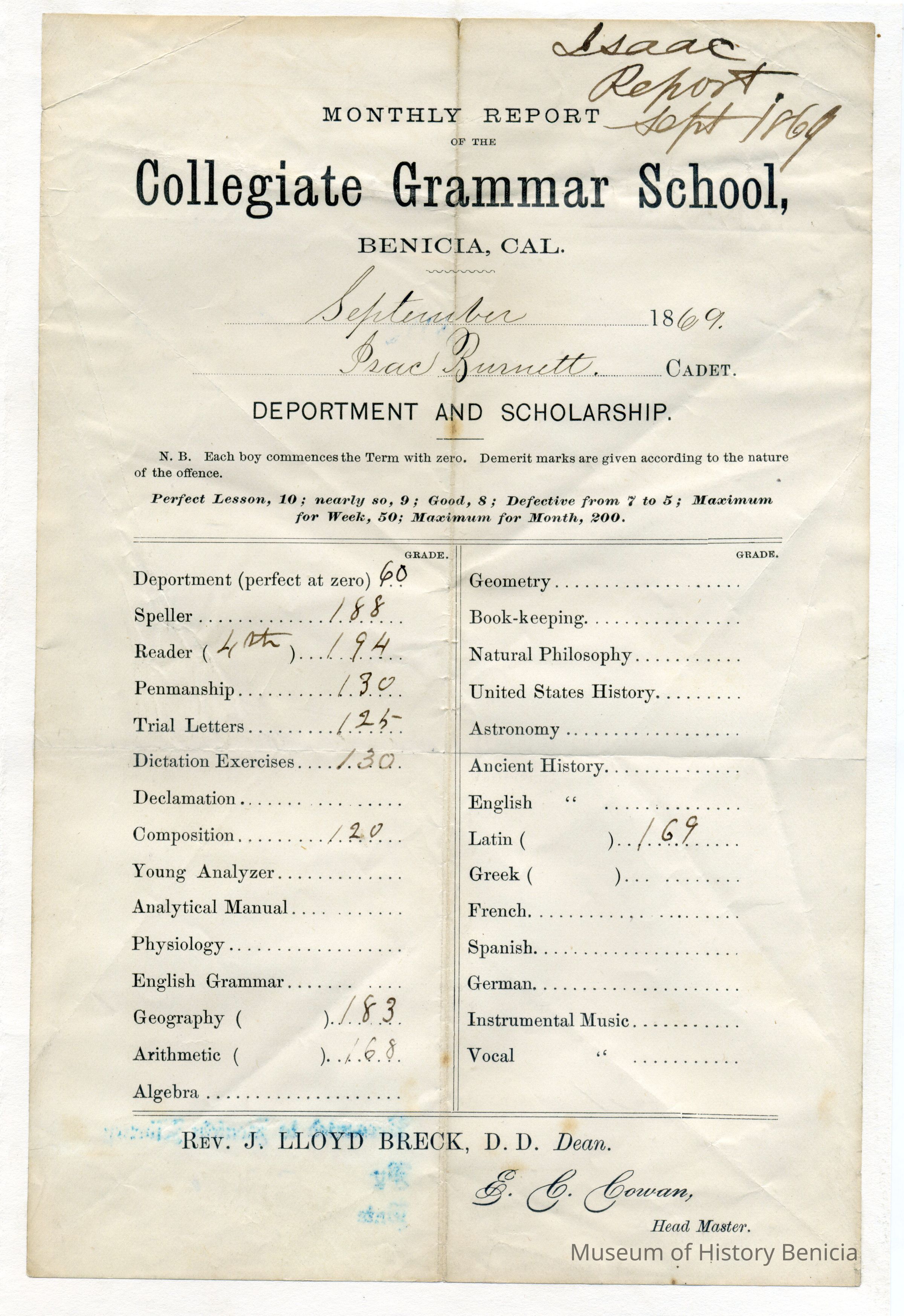 Report Card, Collegiate Grammer School, BeniciaEntry/Object ID