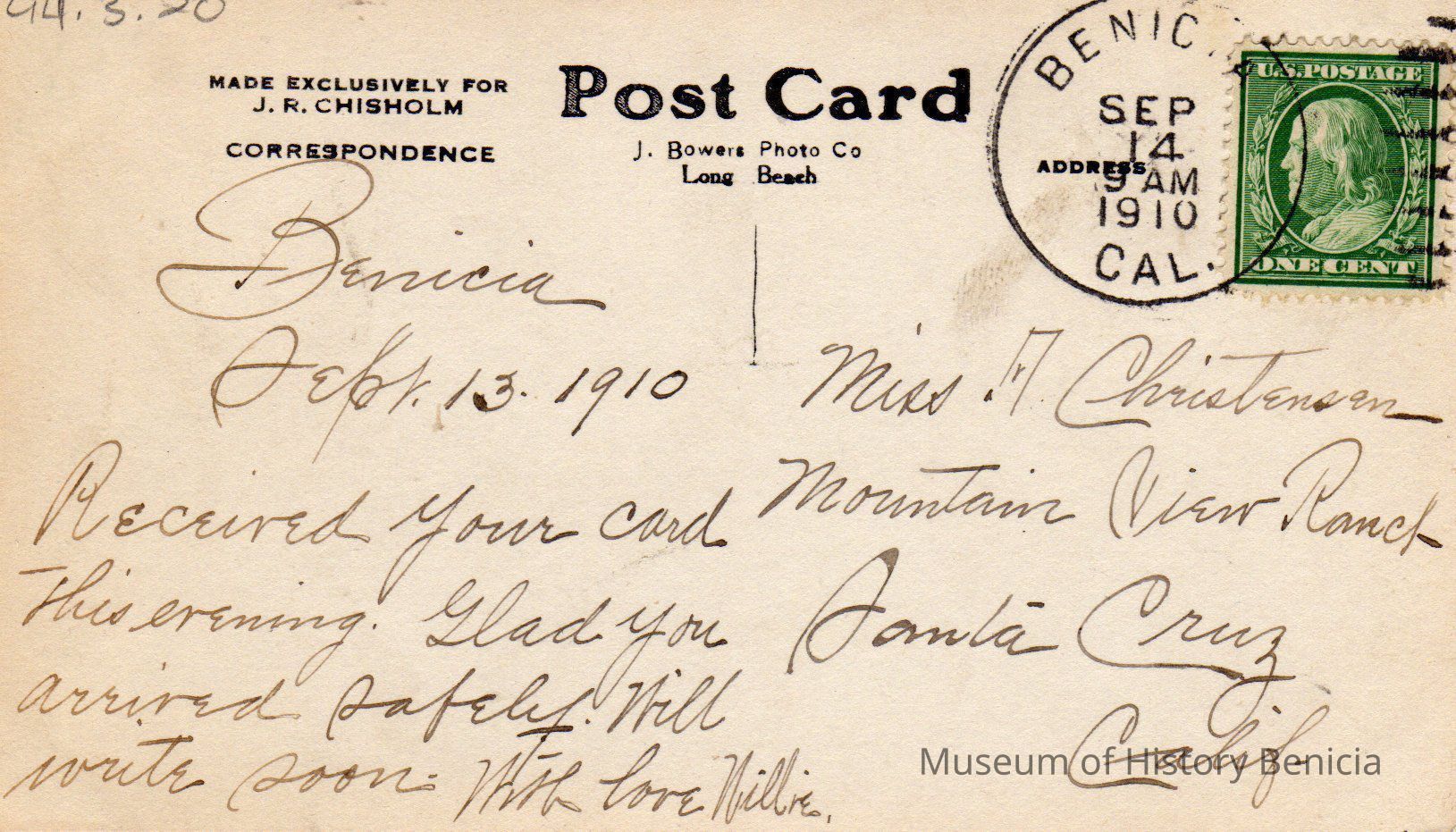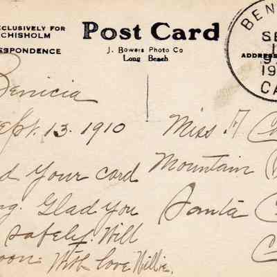 The card was sent to Miss A. Christensen with love Willie written on September 13, 1910 postmarked Sep. 14, 1910 9AMCollection