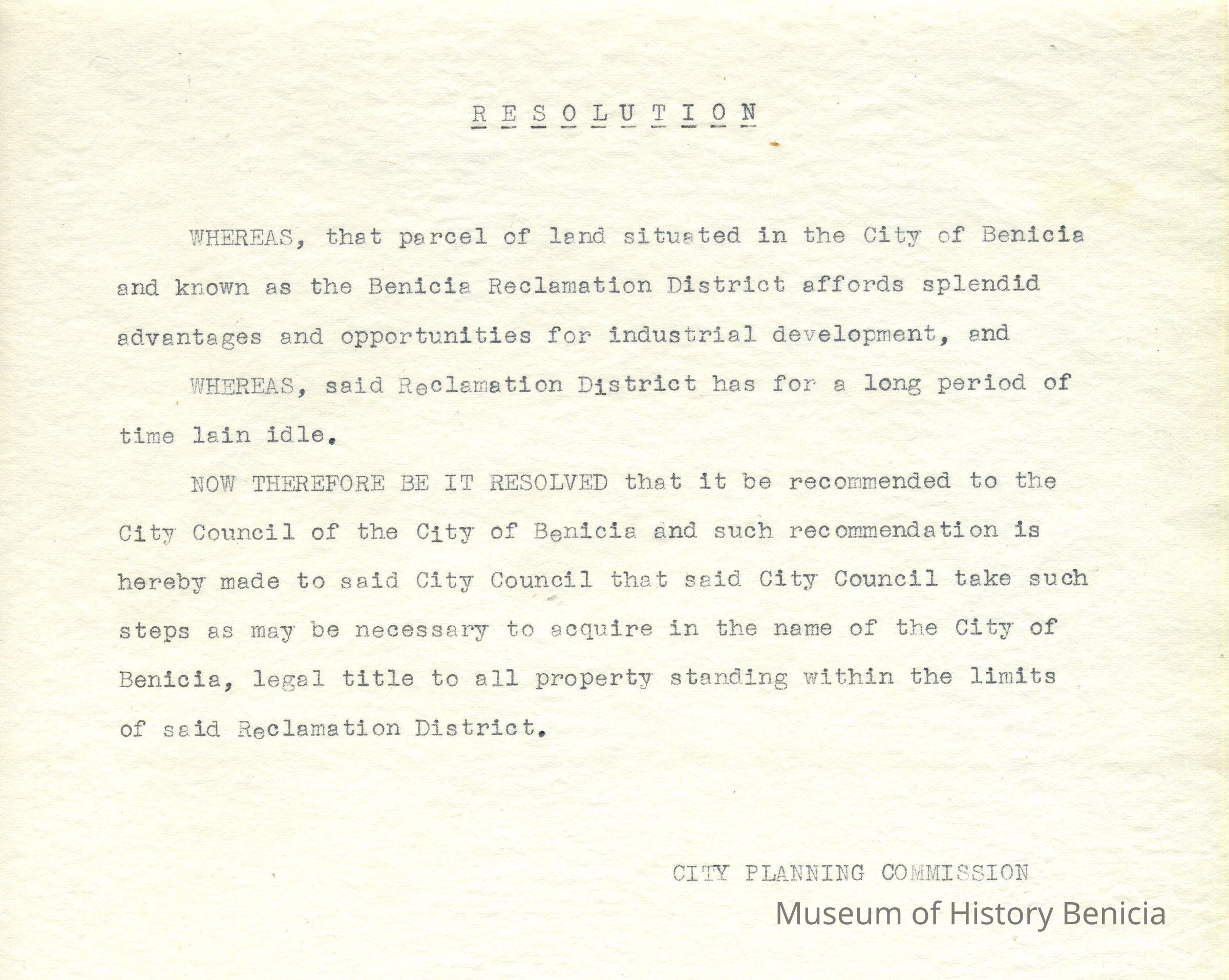 An undated Resolution by the City Planning Commission regarding the acquisition of "legal title to all property standing within the limits of [the]Reclamation District.