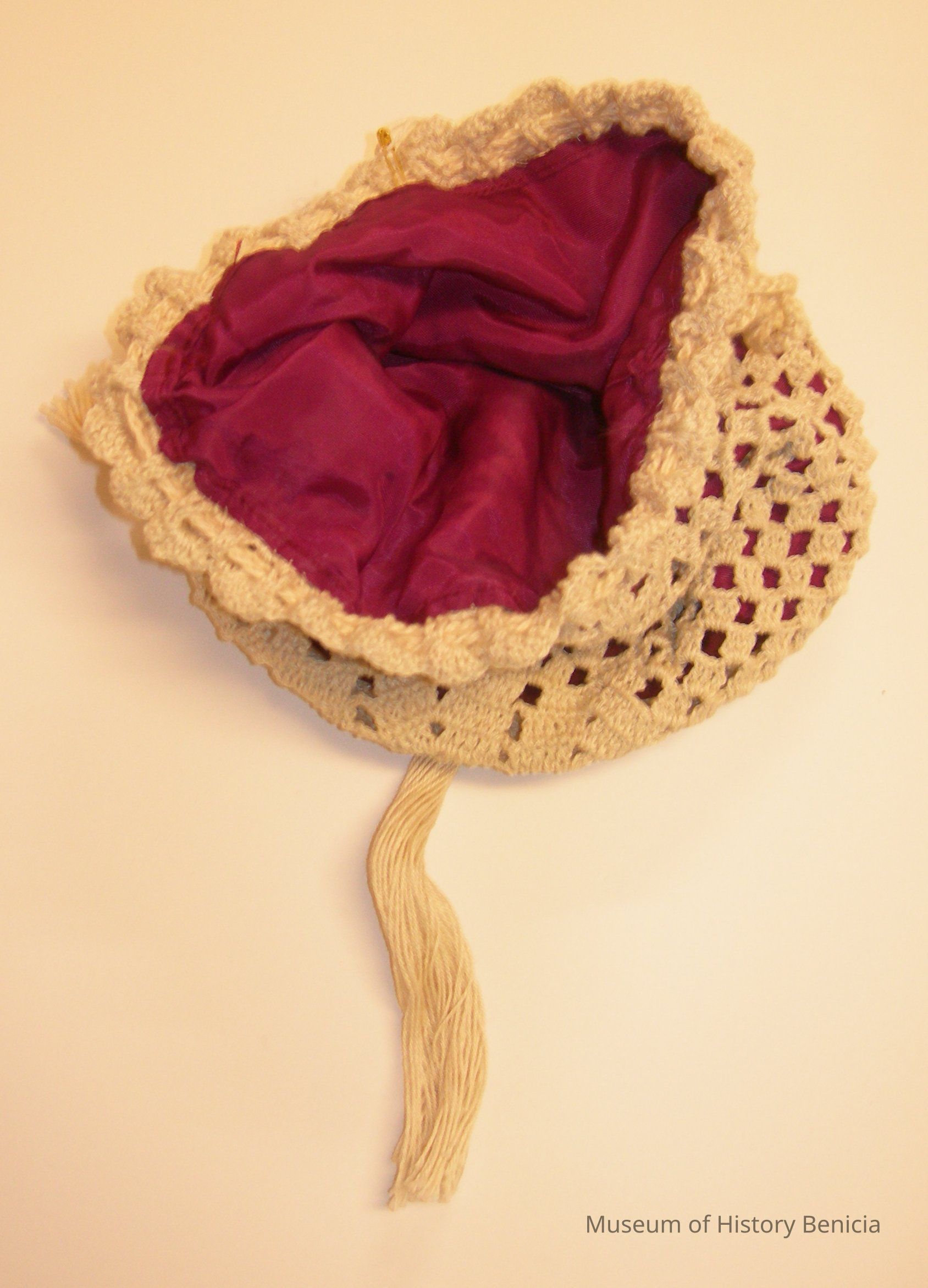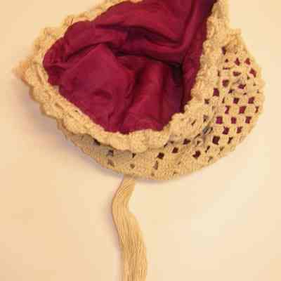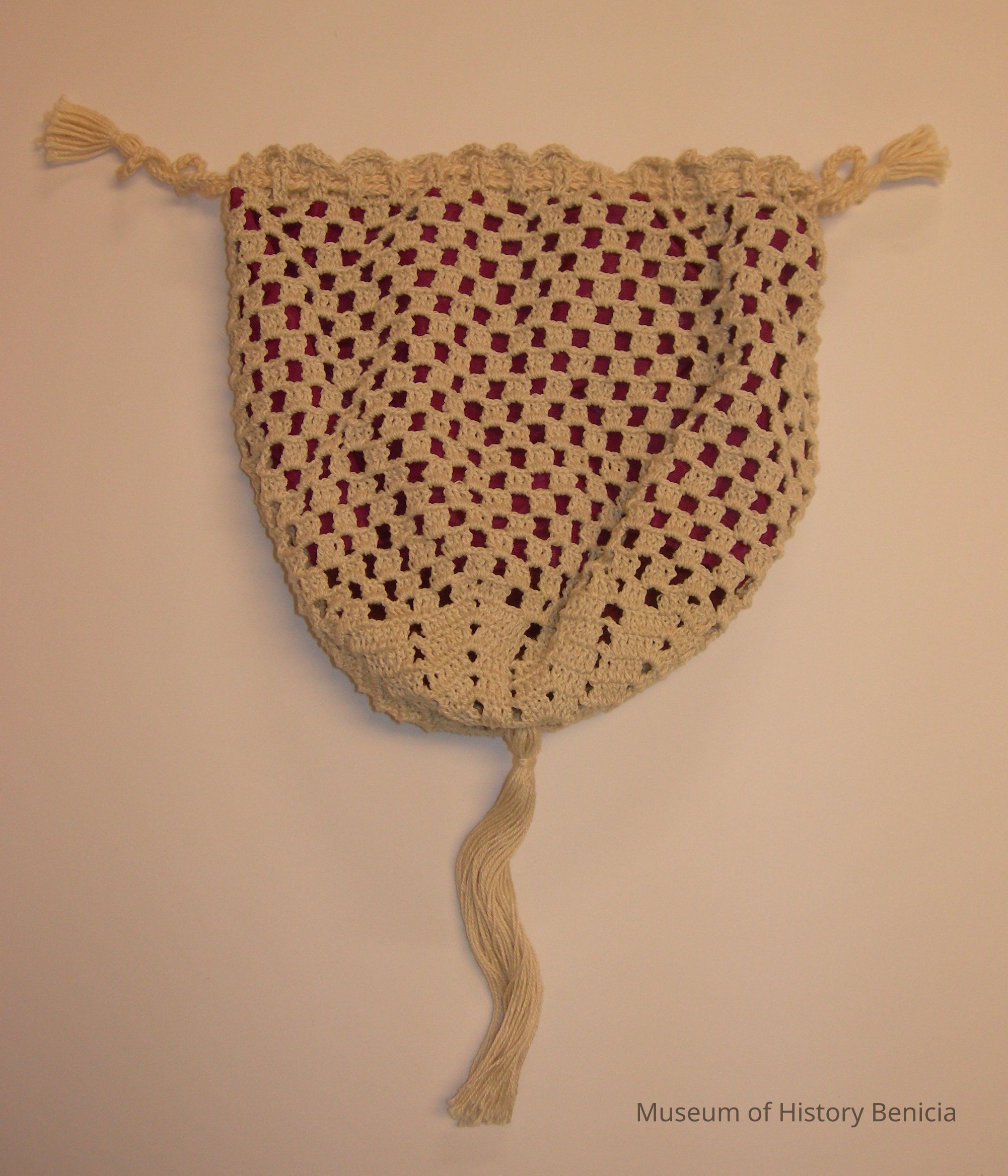Reticule: round, crocheted purse, ecru color with tassel on bottom; two shades of maroon sateen make up the lining; draw-string closure