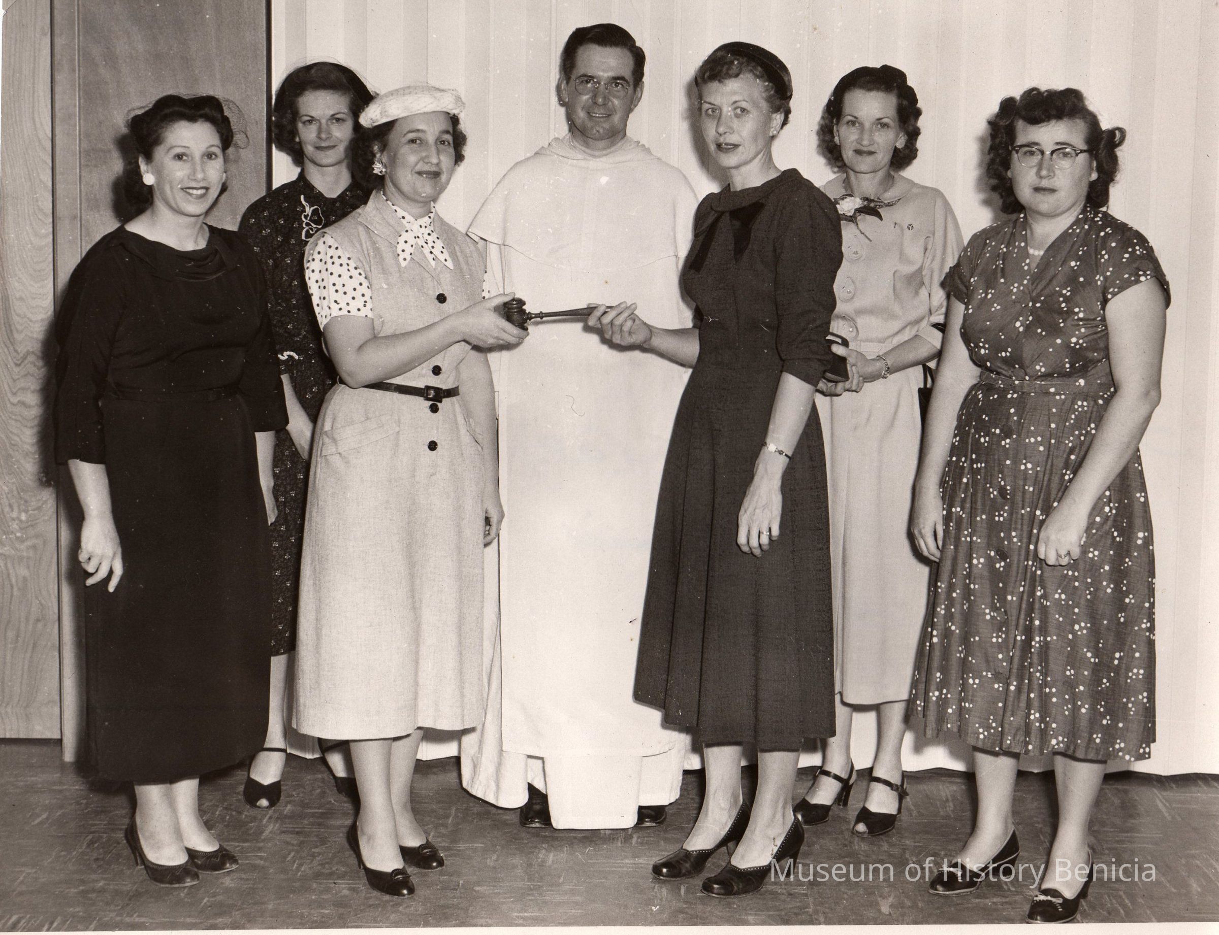 B/W Photograph: Retiring and Incoming Officers of CYO (Catholic Youth Organization) Mother's Club: L-R: Mrs. George Lewis, Mrs. Henry Ponti, Mrs. Ed (Lois) Sheetz, Father Walter Horan O.P., Mrs. Robert (Ann) Marchioni, Mrs. Peter (Letta) Lippert, Mrs. Harold (Geneva) Moore. This was taken as past president Lois Sheetz passed the gavel to new president Ann Marchioni.