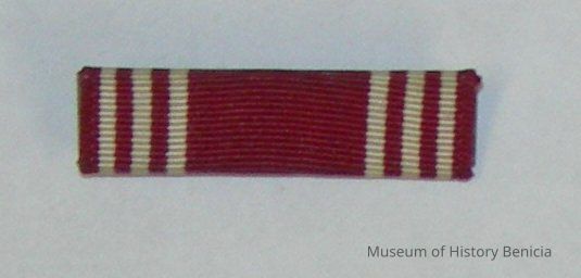 Good Conduct ribbon to be worn on chest of military uniform; red with three white stripes on each side; pin back