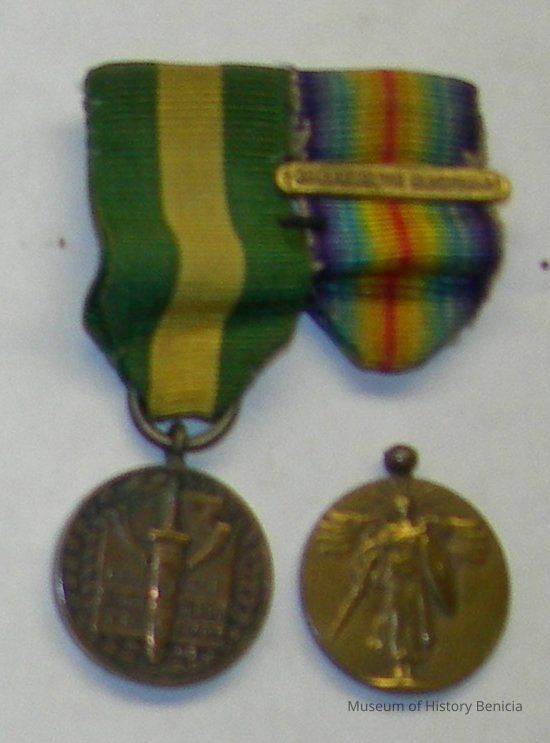 left one: green ribbon w/yellow stripe in middle; medal front: "for Service on the Mexican Border" and back: Eagle w/arrows, crossed rifles and crossed cannons
