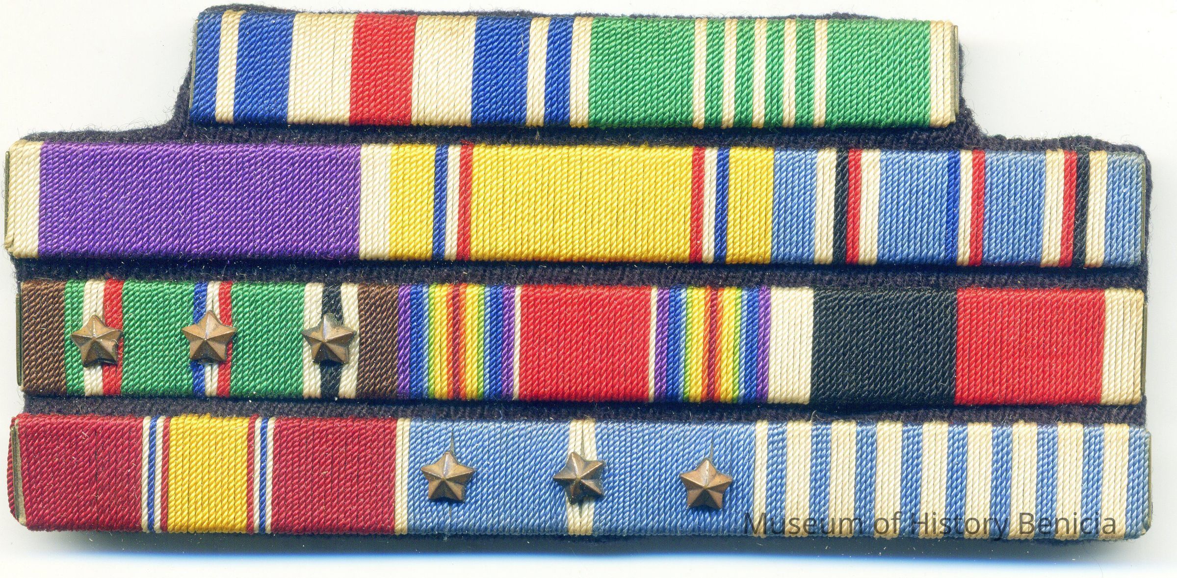 This is a military ribbon. It is four bars and two of the bars have three stars on them. Not sure what battles or wars are indicated or what honors were bestowed on the owner of this ribbon.Collection