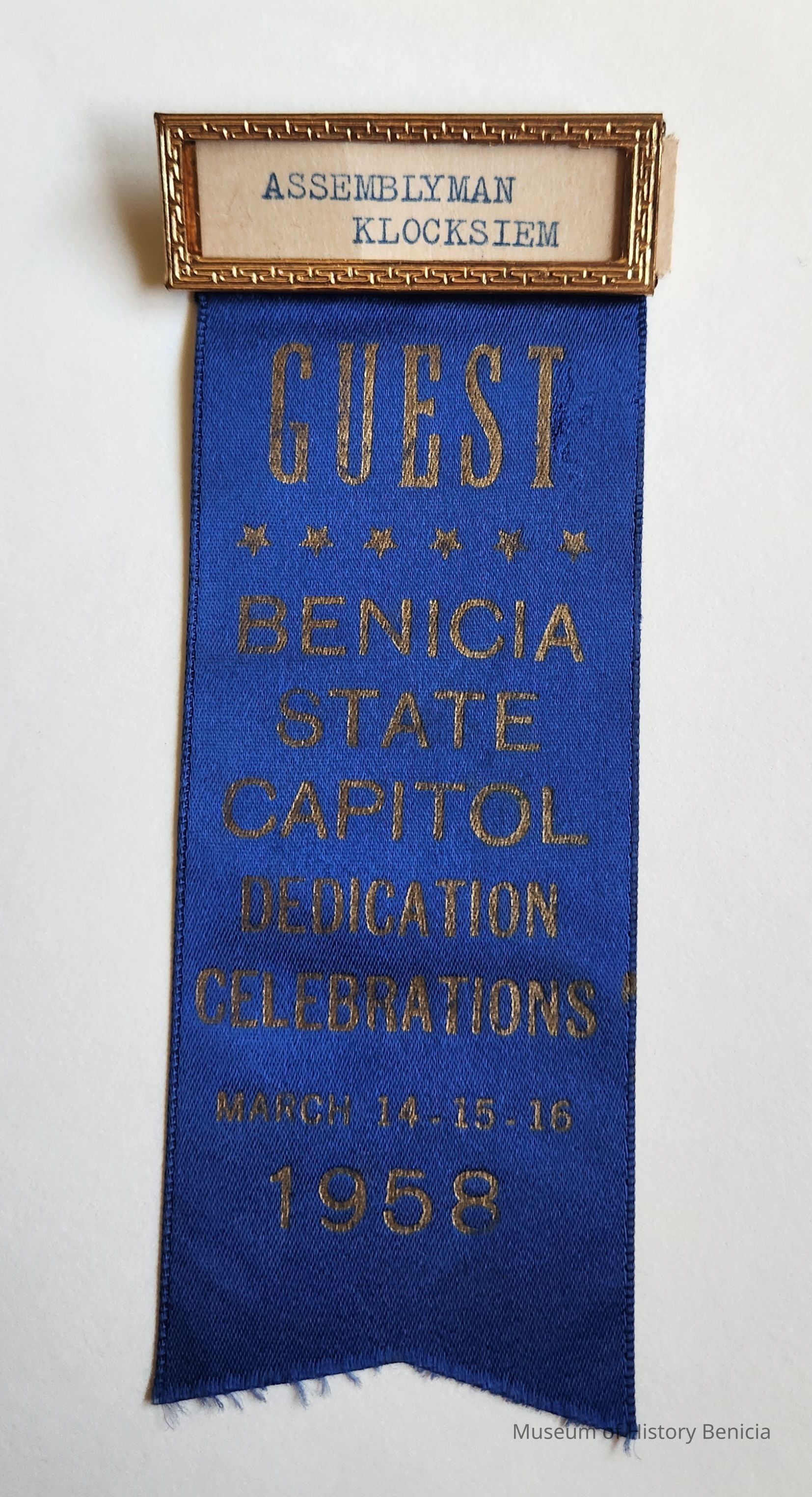 On the ribbon: Guest / Benicia / State / Capitol / Dedication / Celebrations / March 14 - 15 - 16 / 1958Collection