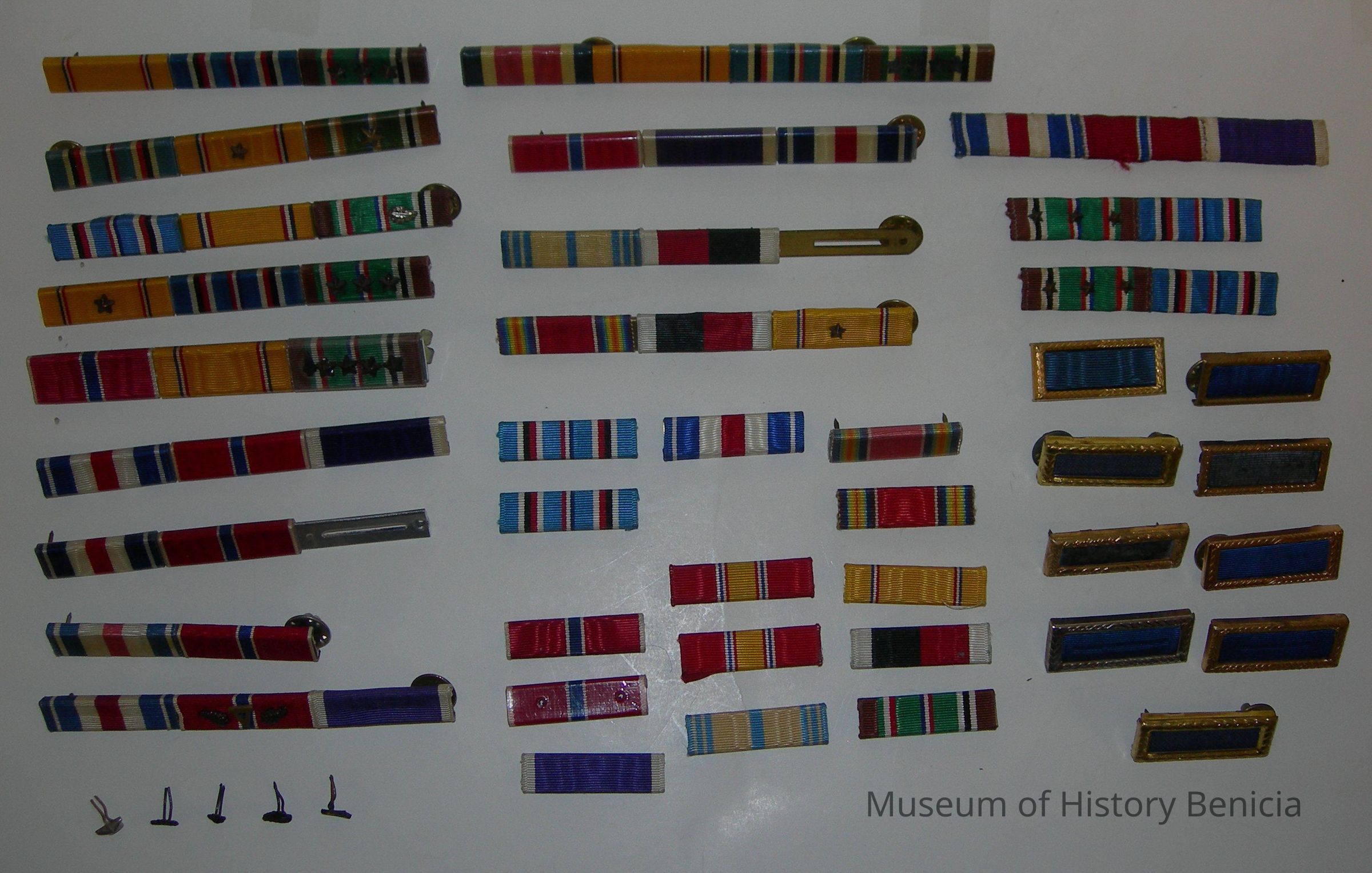 Awards represented in varying numbers: American Defense Service, American Campaign WWII, European-Africa-Mid East WWII, Bronze Star, Silver Star, Purple Heart, National Defense, Victory WWII, WWII Occupation, Armed Forces Reserve, Presidential Unit Citation, Belgian Croix de Guerre; also included are small stars, clusters and "V's" to attach to ribbons and empty barsCollection