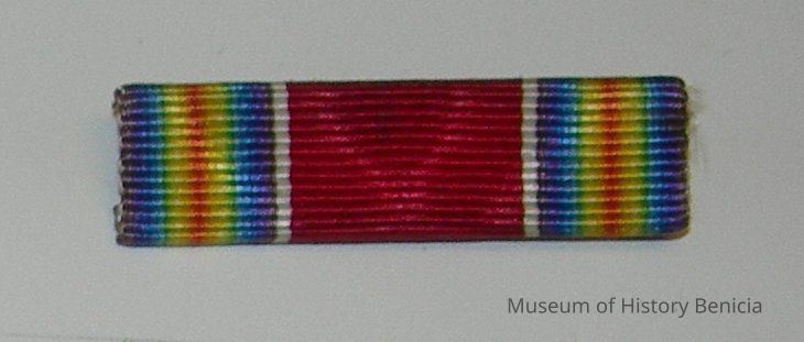 Ribbon - Commemorative - Victory World War II, pin--on; red in center with rainbow-look stripes on each edge; 1-1/2" wide x 3/8" high