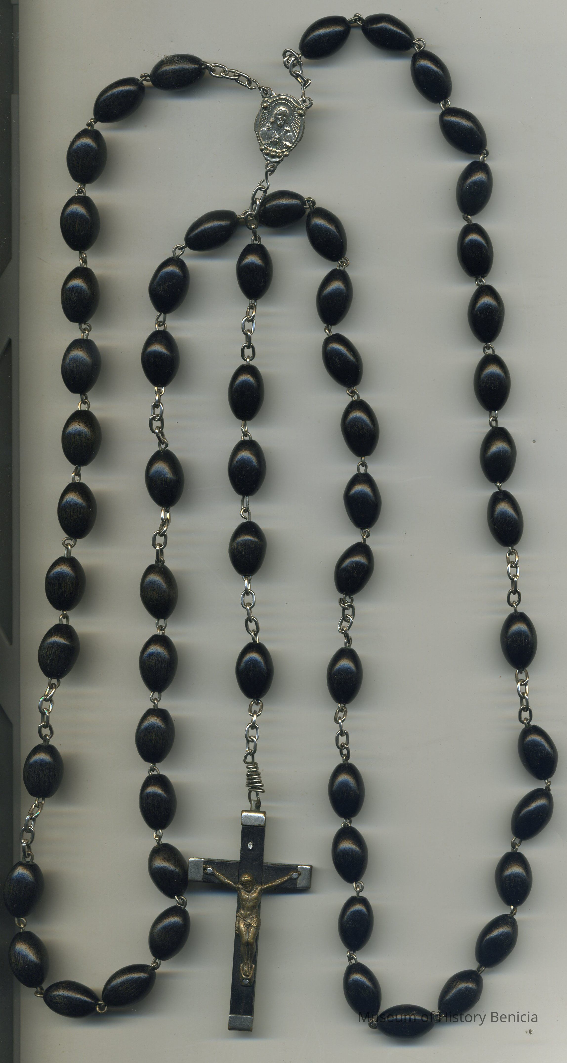 Rosary - black oval beads, silver chain, black wood with silver backing cross; 31-1/2" long