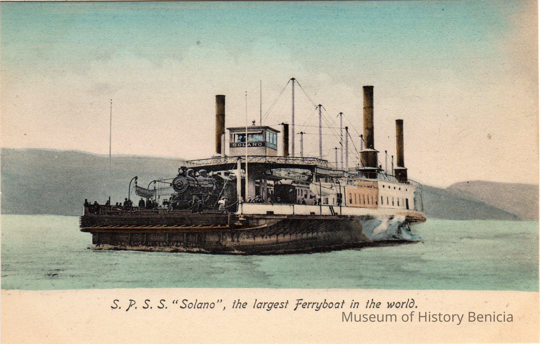 Hand-colored postcard of the S.P.S.S. "Solano", the largest ferry boat in the world.