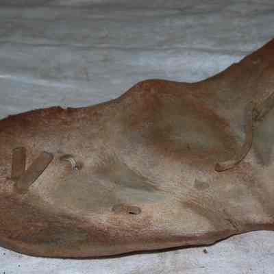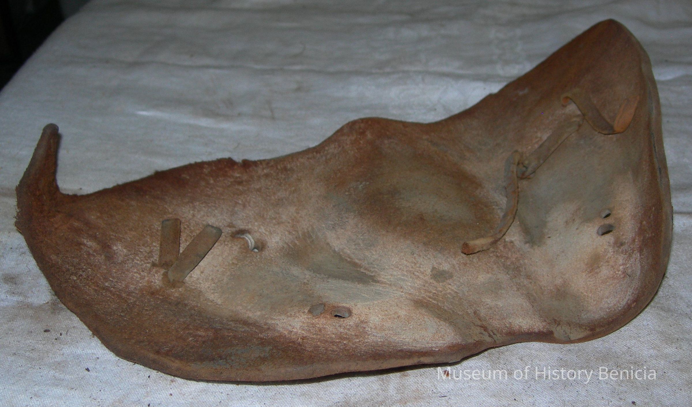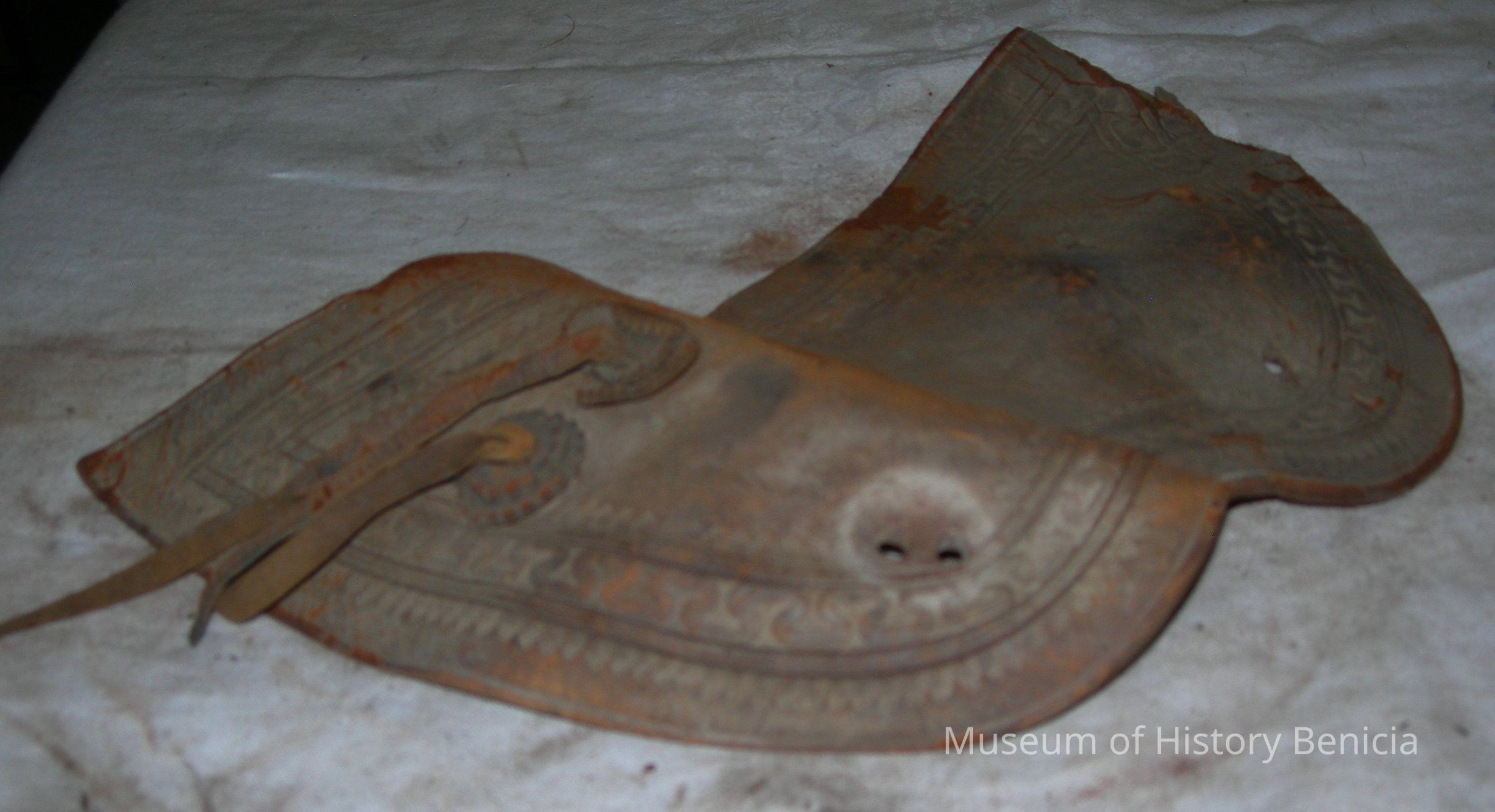 Part of a saddle with leather ties, protects and pads rider's thigh 17" long, 8" wide