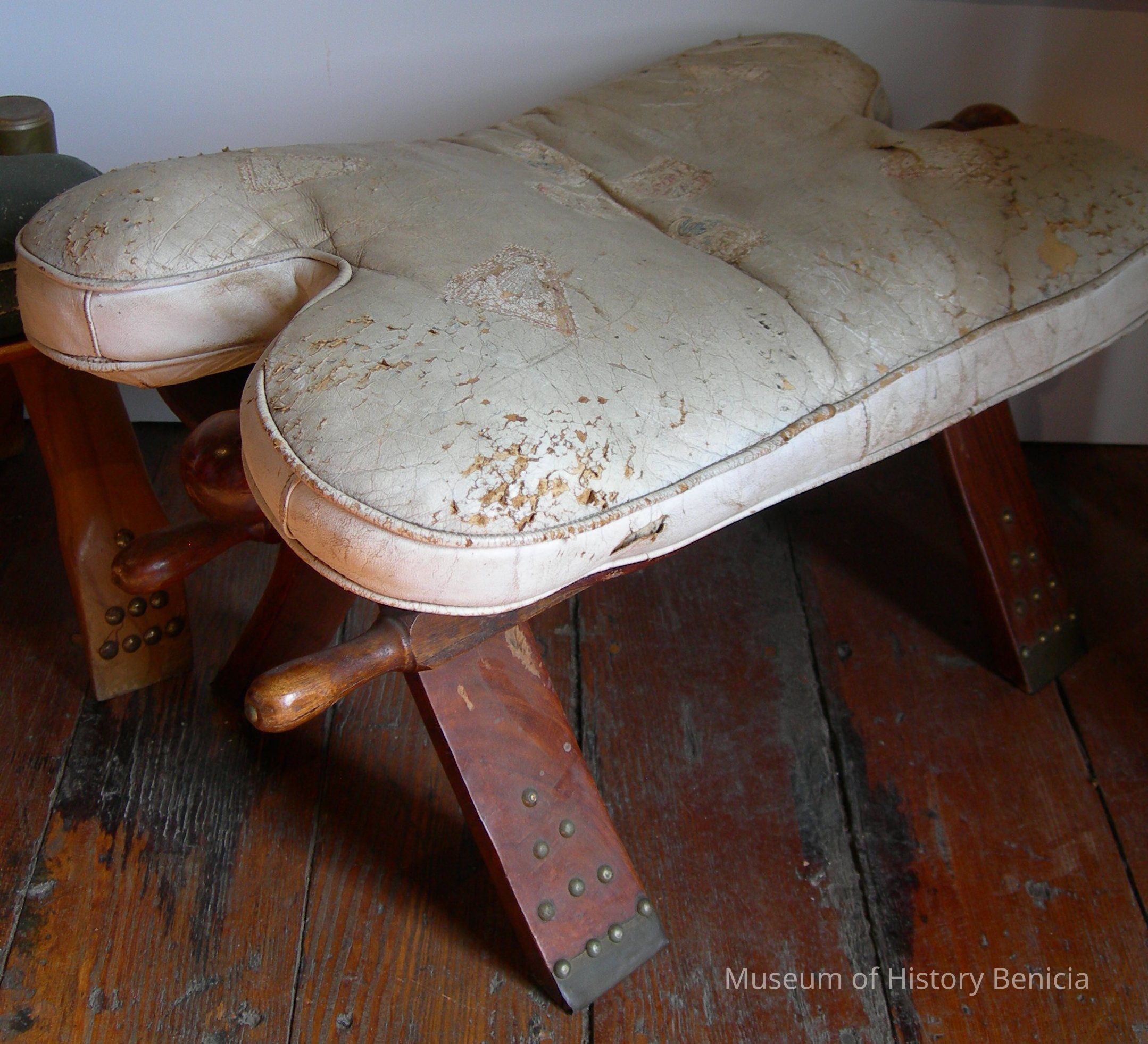 Camel saddle: dark stained, shiny wood base - nail studs on all legs (10 on each leg); top is light gray leather with painted on design which is mostly worn off; top is split; the seat was well used.Collection