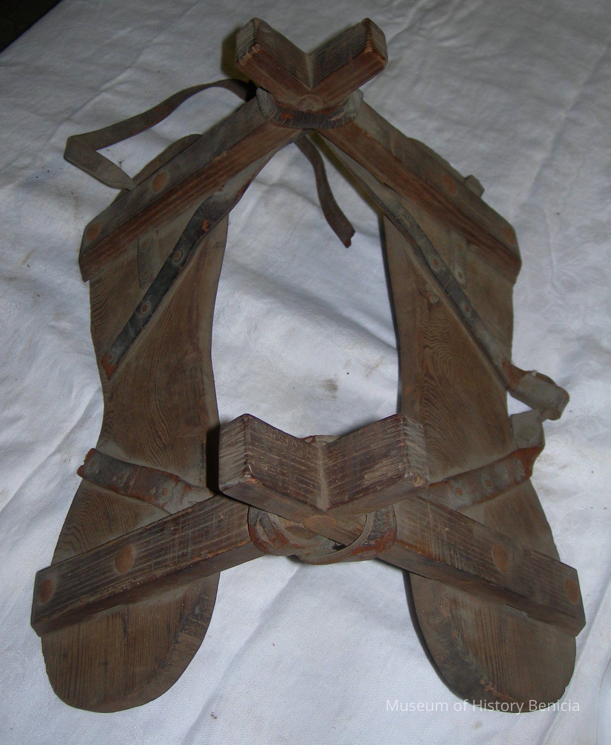 Pack saddle of wood with leather straps dimensions: height: 18", width: 15", depth: 11"