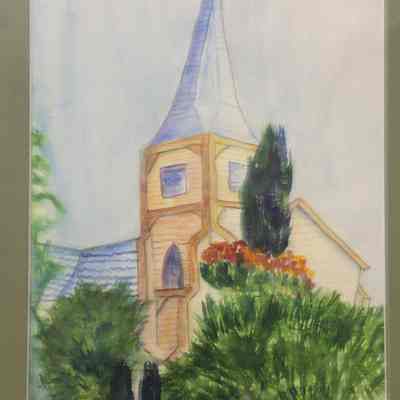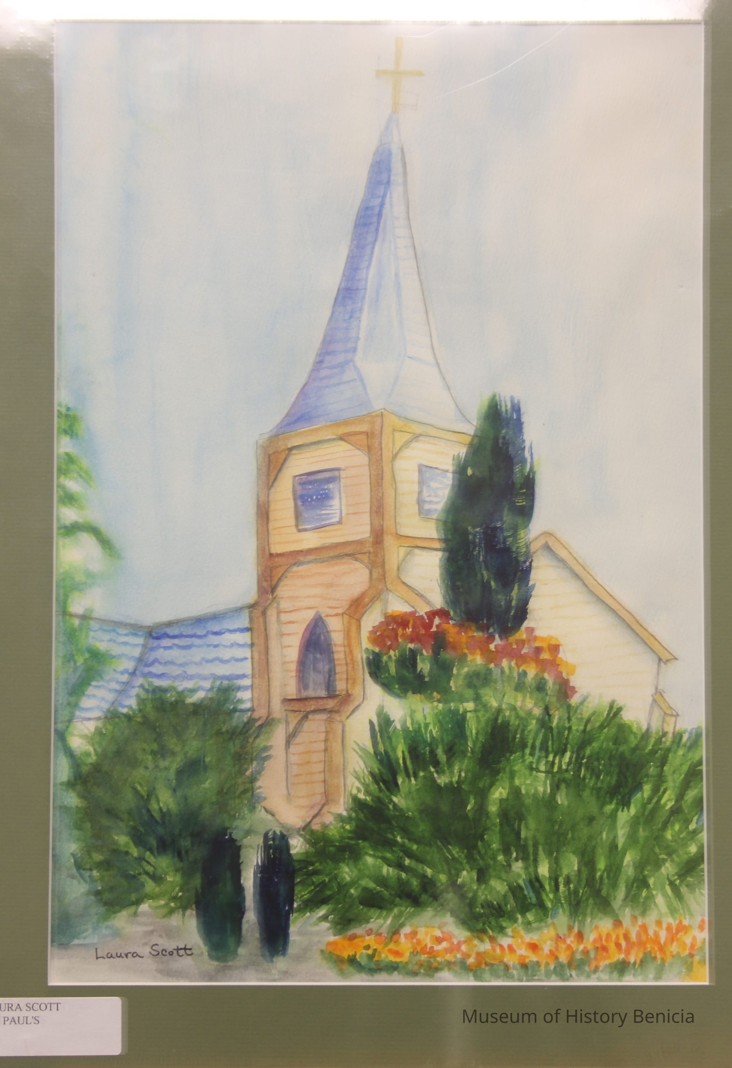 "Saint Paul's Church" watercolor painting done by Laura Scott in 1995, a Benicia Middle School student matted and mounted on foamcore