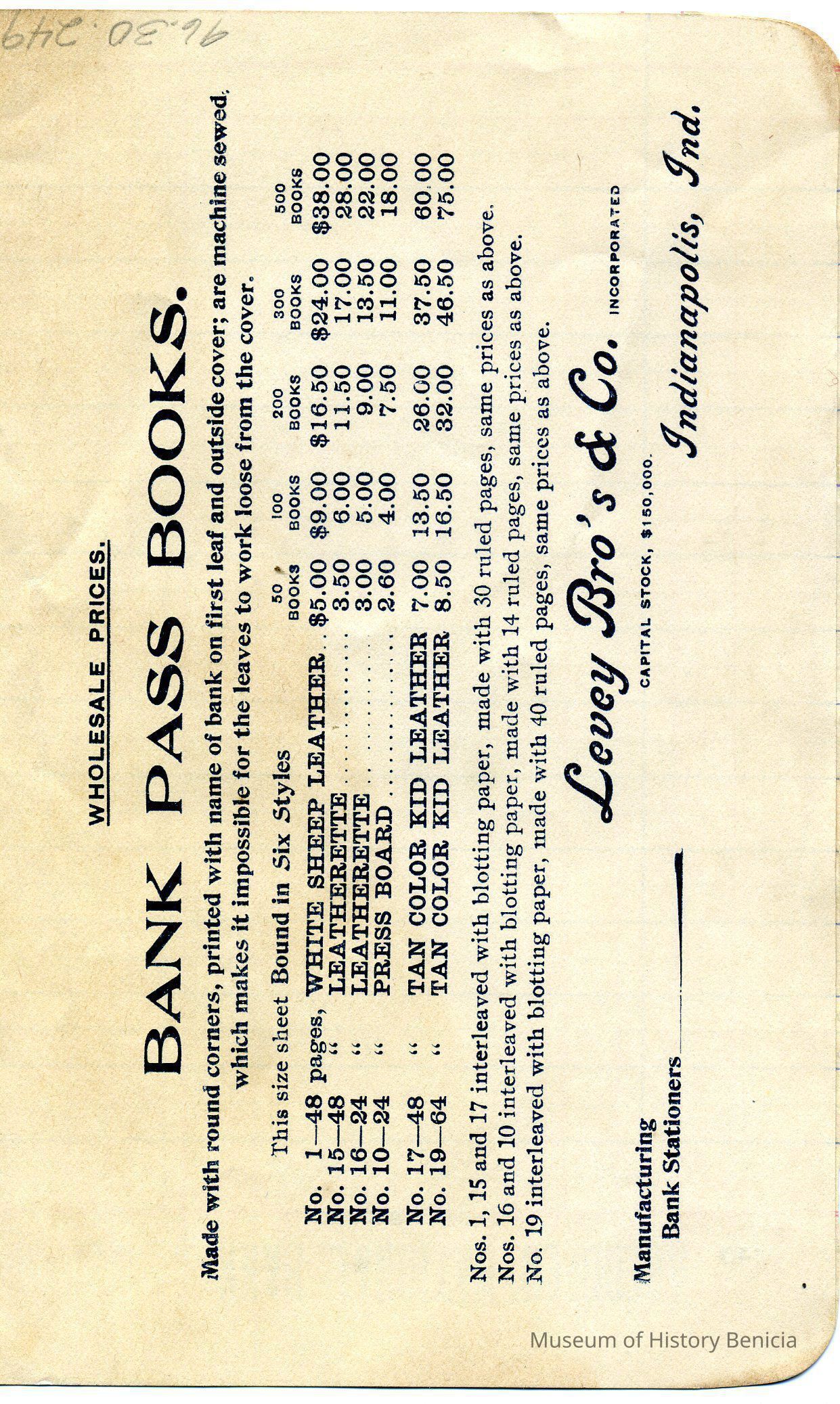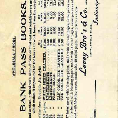 Sample of a Bank Pass Book - with whole sale prices on the back from Levey Bro's & Co. Incorporated, Capital Stock, $150,000.