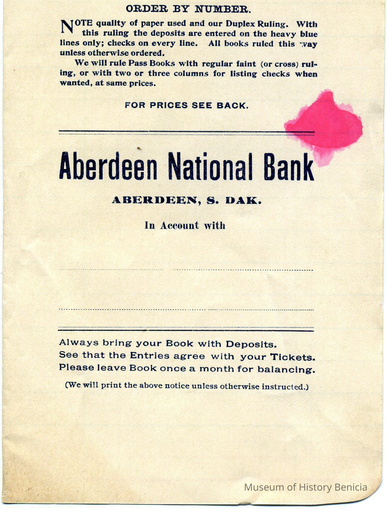 On front sample "Aberdeen National Bank, Aberdeen, S. Dak" inside is a sample of the inside of a bank passbook