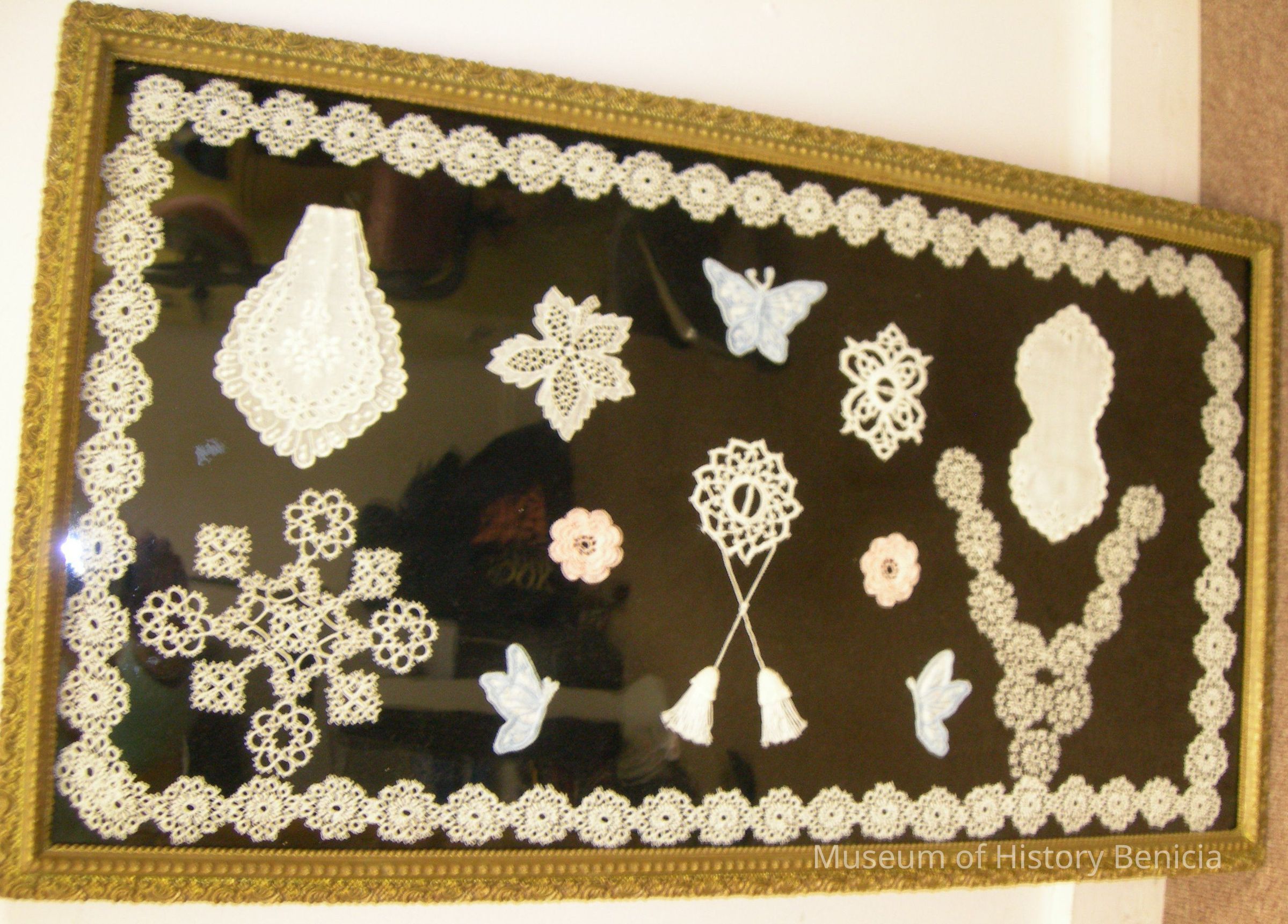 Framed under glass with old fashioned, slightly gilded frame: sampler/display of various types of handiwork (crochet, tatting and embroidery) on black felt background; small white "doily-like" connected circles are around the outer edge; twelve samples are in the center in varying type and shapes, mostly in white threads, some pink and blue also.