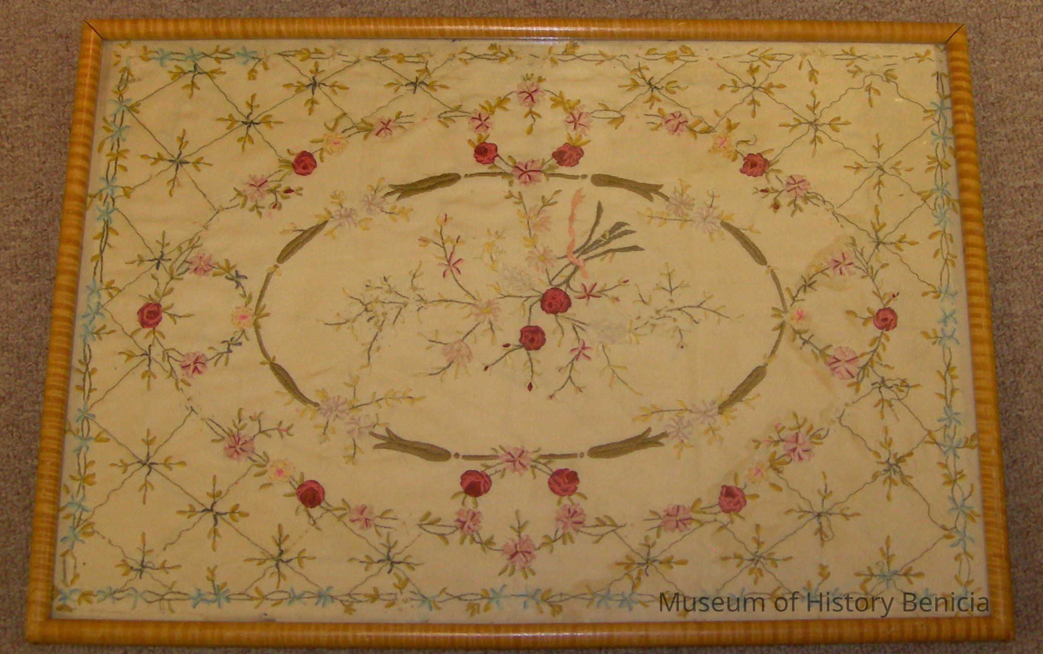 framed, under glass, embroidered sampler: flowers, leaves, and stems colors: blue, green, red, pink, yellow on beige background